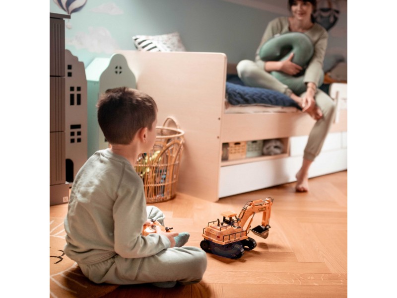 \n„WOOPIE“ prekės ženklo nuotoliniu būdu valdomas ekskavatorius yra idealus žaislas kiekvienam mažajam statybinės technikos gerbėjui. Transporto priemonė pagaminta iš aukštos kokybės plastiko ir turi plačius guminius vikšrus, todėl žaislas puikiai įveikia net sudėtingiausią reljefą. Be to, žaidžiant namuose, guminiai vikšrai nebraižo grindų. Pagamintas skiriant dėmesį smulkiausioms detalėms, šis modelis yra puiki tikros mašinos imitacija (mastelis 1:24). Paverskite savo vaiko kambarį tikra statybų aikštele.