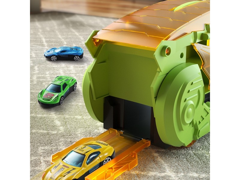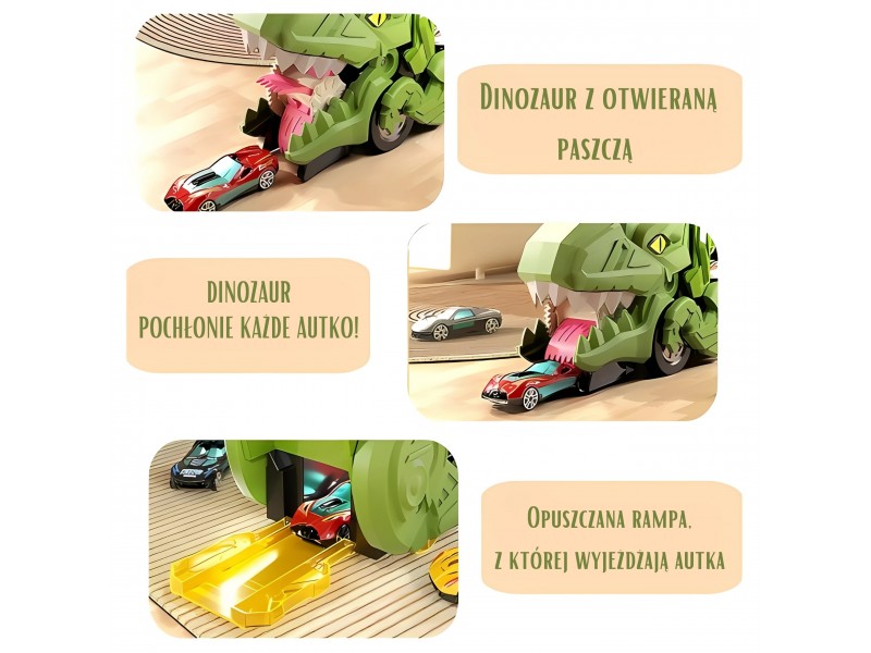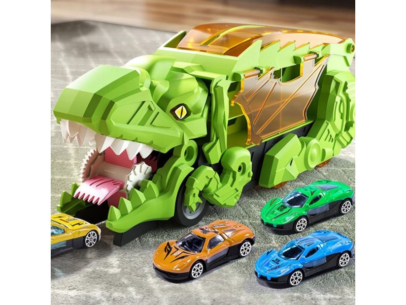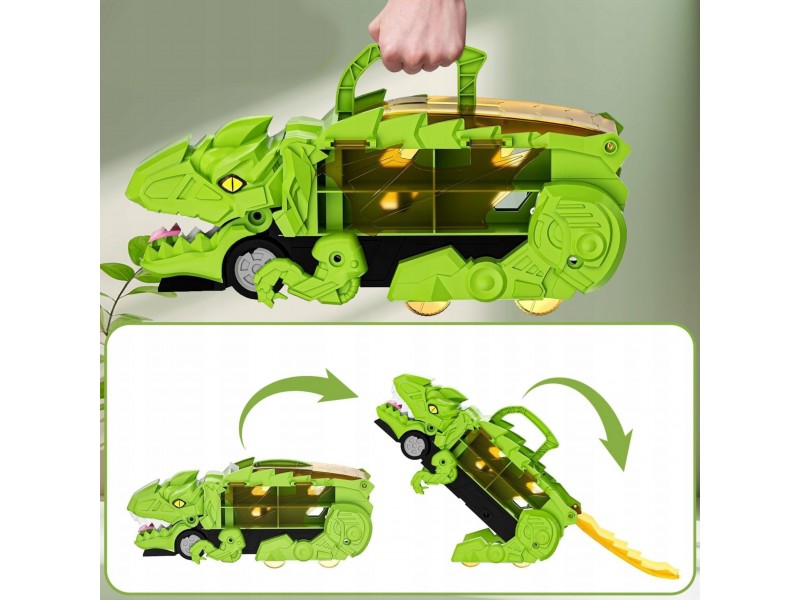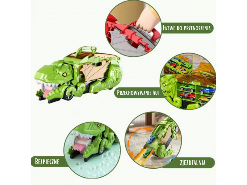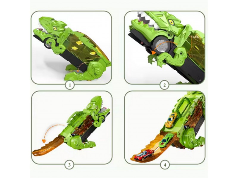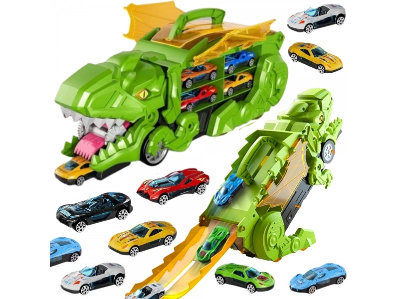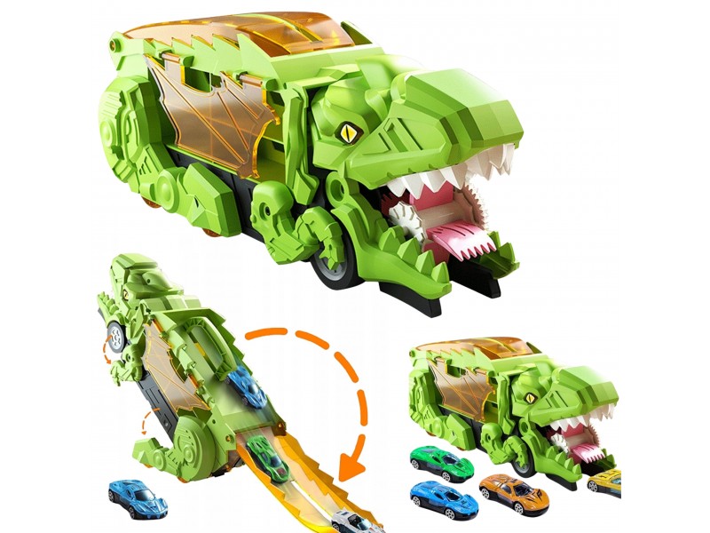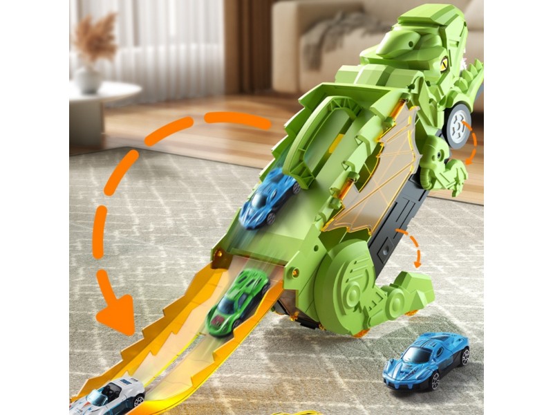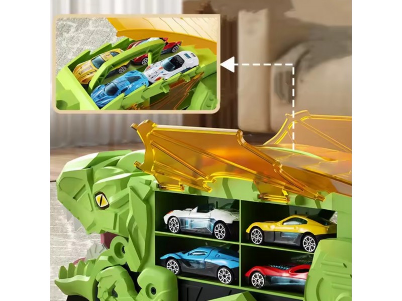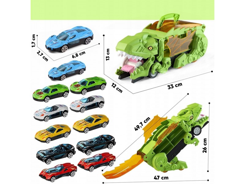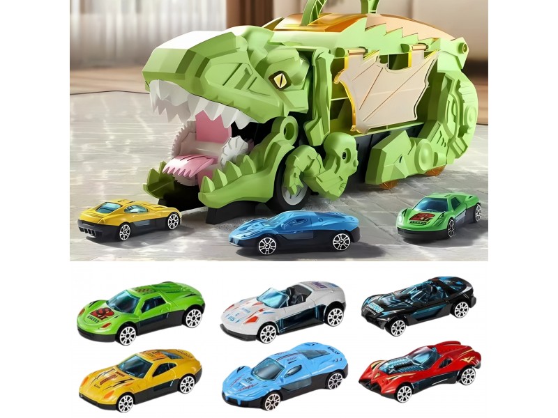 Pasinerkite į jaudinantį priešistorinių nuotykių ir automobilių lenktynių pasaulį! Šis neįtikėtinas dinozauras rijikas su mašinėlėmis yra tikras atradimas kiekvienam mažajam transporto priemonių ir dinozaurų gerbėjui. Dinozauro formos lagaminas su rankena ne tik patogiai talpina visą rinkinį, bet ir transformuojasi į interaktyvią lenktynių trasą. Išlanksčius žaislą, jis virsta trasa, kuria gali skrieti rinkinyje esančios mašinėlės. Rinkinį sudaro net 6 transporto priemonės, todėl pramogos tęsis valandų valandas – vienam ar su draugais!