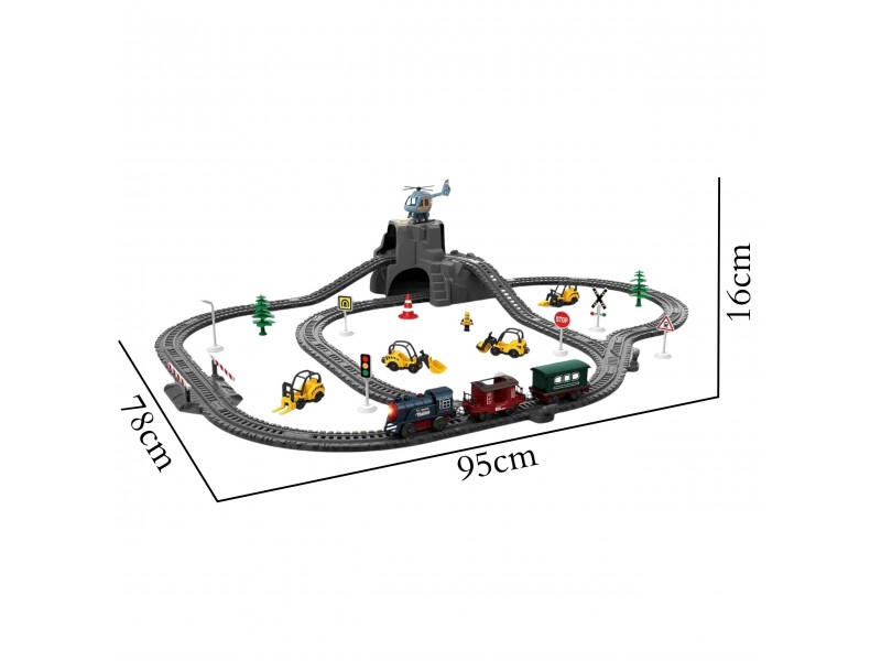 - Bėgiai, kurių bendras ilgis leidžia sukurti didelę trasą (95 × 78 cm).