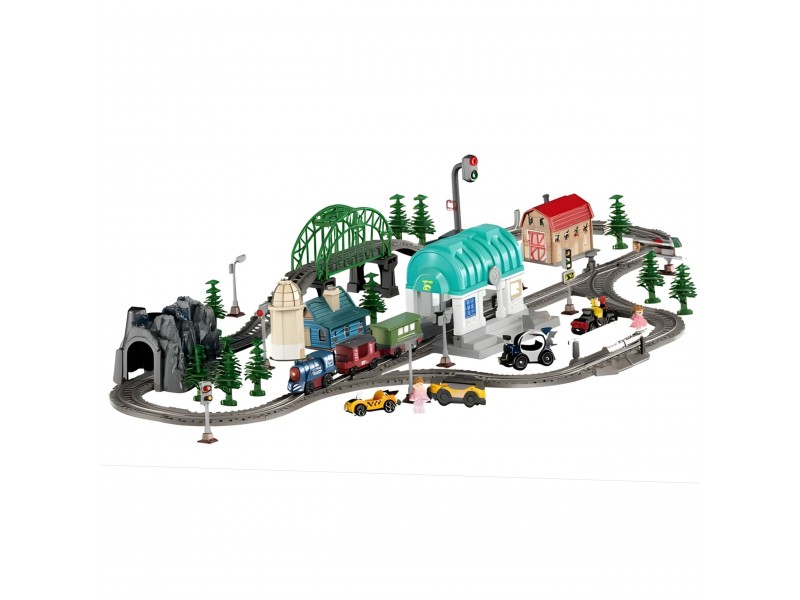 • 100 elementų rinkinyje – įskaitant bėgius, tiltą, tunelį, stotį, transporto priemones ir figūrėles.