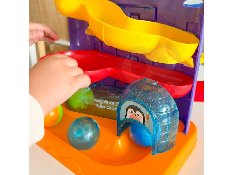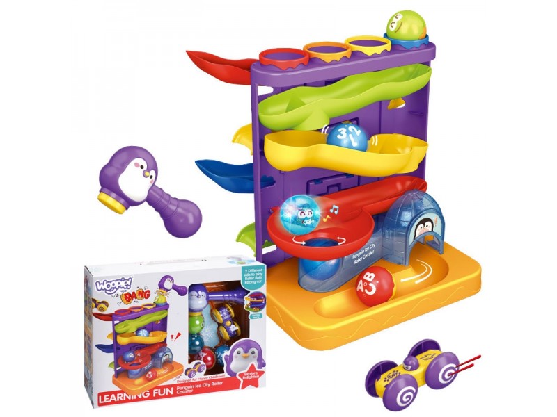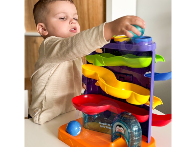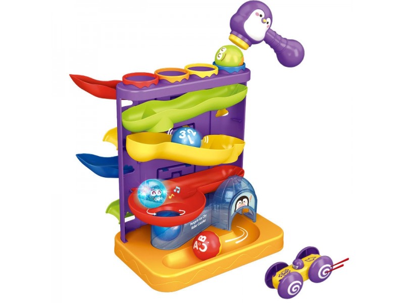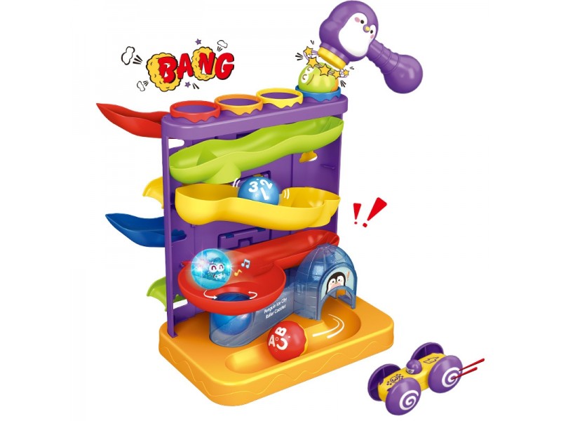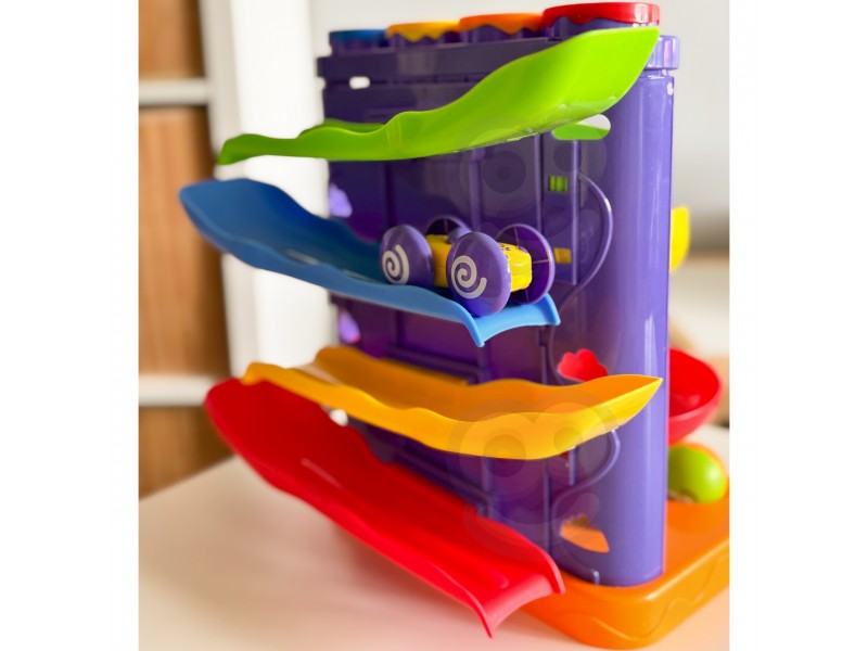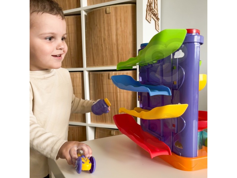 Mažus vaikus itin įtraukia veikla, kai reikia įdėti spalvingus kamuoliukus į angas, suduoti jiems plaktuku ir stebėti, kaip jie greitai rieda rampomis. Kitoje žaislo pusėje yra įrengtas nusileidimo takelis mašinėlėms (čiuožykla) – čia statomas pridedamas automobiliukas, kuris smagiai čiuožia žemyn. Rinkinyje esantys kamuoliukai taip pat gali būti naudojami mokymuisi, pavyzdžiui, skaičiavimo ar abėcėlės pažinimui. Žaidimas lavina akių–rankų koordinaciją, smulkiąją motoriką bei skatina vaizduotę.