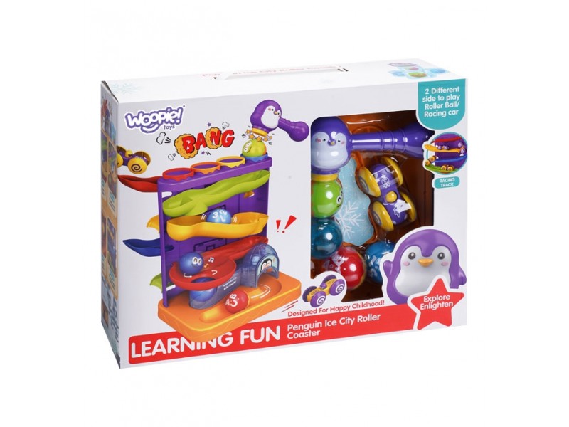 Prekės ženklo Woopie kamuoliukų trasa – tai daugiafunkcinis 3in1 žaislas, kuris sudomins vaiką ir padės jam tobulėti. Šis rinkinys pasižymi trimis pagrindinėmis funkcijomis. Pirmoji – tai kalimo žaidimas, skirtas ankstyvajam vystymuisi: vaikas turi pramušti 4 kamuoliukus pro skylutes ir stebėti, kur jie nuriedės latakais žemyn. Rinkinyje esantis plaktukas yra lengvas, mažas ir pritaikytas mažoms rankytėms, todėl jį patogu laikyti.