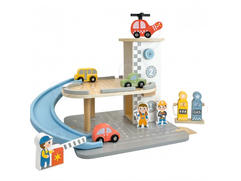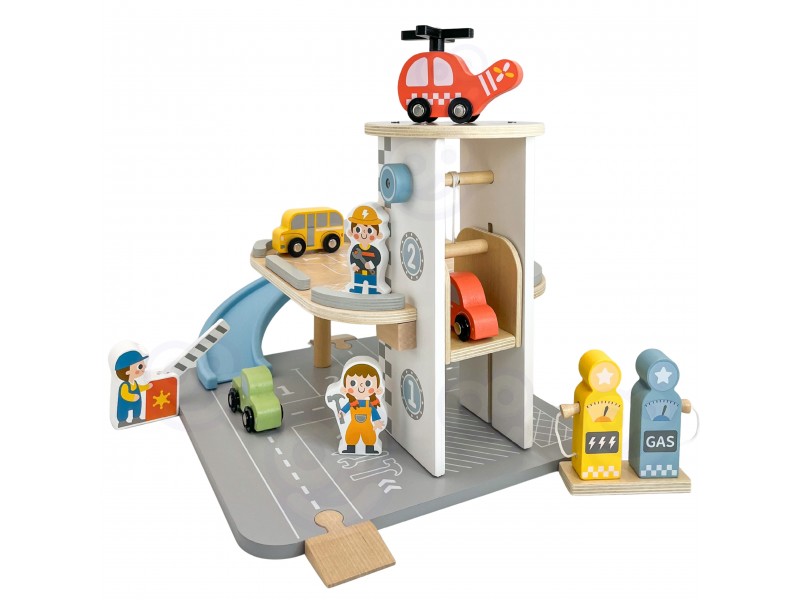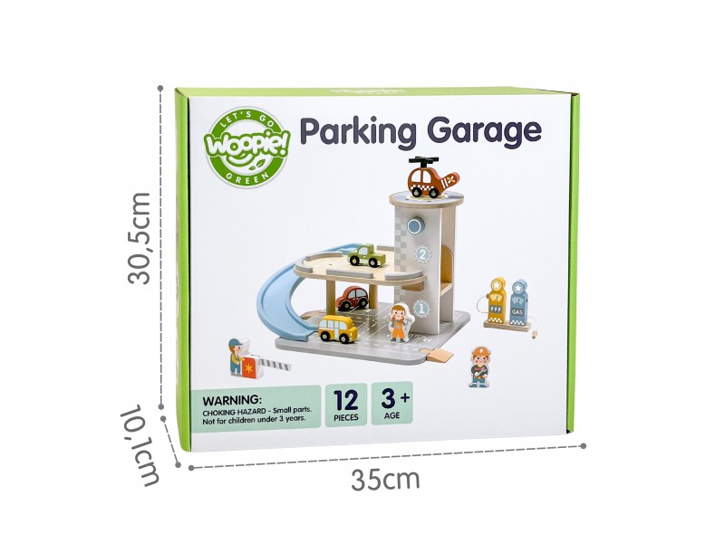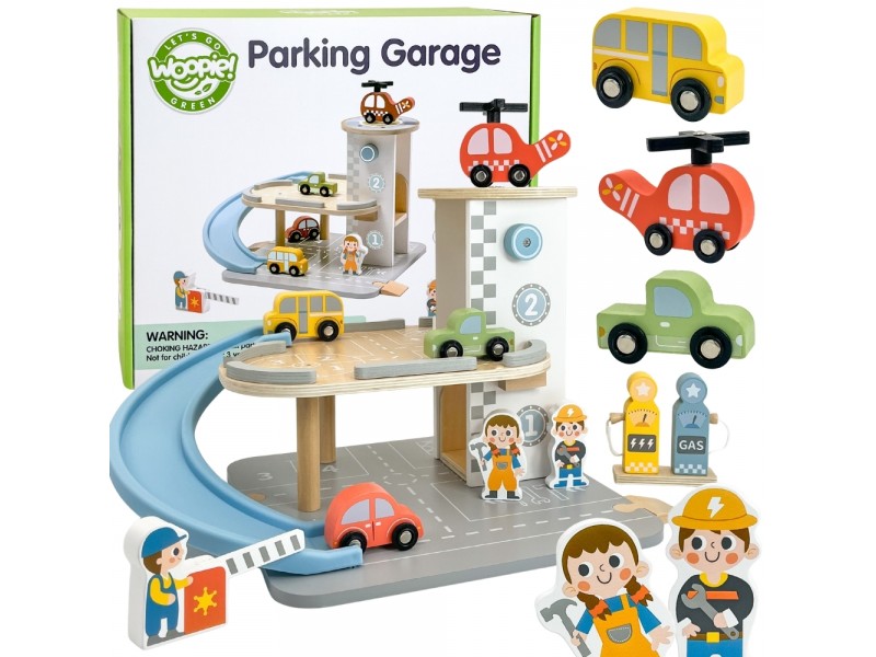 Ši daugiafunkcinė medinė automobilių stovėjimo aikštelė iš Woopie Green serijos yra tikra svajonė kiekvienam mažajam transporto priemonių gerbėjui. Tai ne tik garažas, bet ir degalinė, siūlanti daugybę kūrybiško žaidimo variantų. Vaikai galės leisti spalvingas medines mašinėles žemyn spiraline trasa, nutupdyti sraigtasparnį specialioje aikštelėje ant stogo ir su darbuotojų figūrėlėmis aptarnauti degalinę. Tvirta medinė konstrukcija, pasižyminti švelniomis pastelinėmis spalvomis, taps stilinga vaiko kambario puošmena.