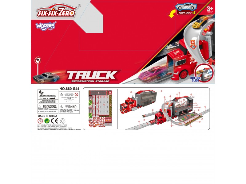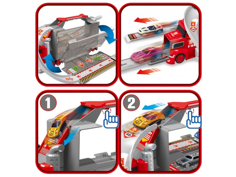 Šis rinkinys yra daugiafunkcis žaislas, kuris akimirksniu gali atlikti klasikinio transportavimo sunkvežimio vaidmenį, o išskleistas virsta įspūdinga lenktynių trasa su paleidimo mechanizmu. Pagrindinė rinkinio dalis – didelis, efektingas sunkvežimis, stilizuotas kaip ugniagesių automobilis. Jis veikia ir kaip transporto priemonė, ir kaip nešiojamas lagaminėlis mašinėlėms bei priedams. Atidarius priekabą ir išlanksčius elementus, vaikas gauna prieigą prie garažo ir lenktynių trasos, kurioje galima rengti jaudinančias lenktynes ir automobilių dvikovas.