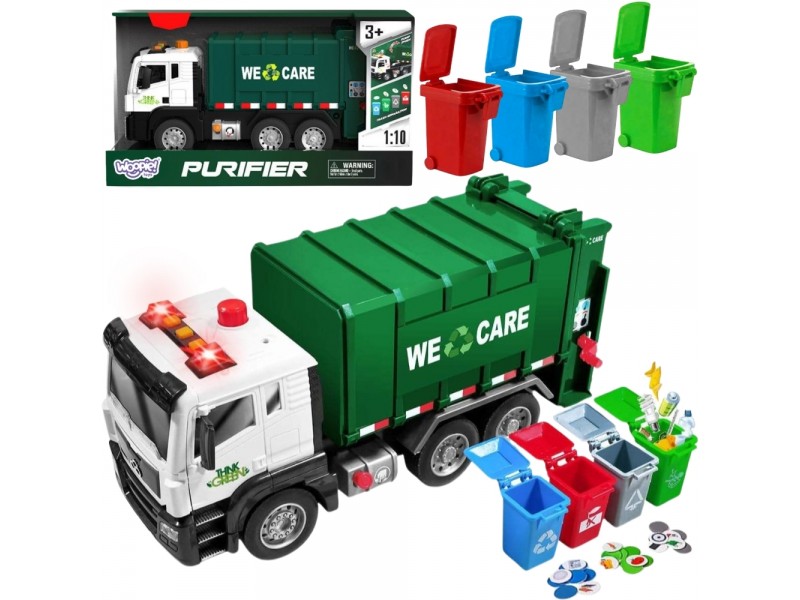 Žaislinė šiukšliavežė „Purifier“ – tai puikiai atkurta komunalinė transporto priemonė (mastelis 1:10), kuri sužavės kiekvieną mažąjį miesto mašinų gerbėją. Realistiškos detalės, judantys elementai bei garso ir šviesos funkcijos paverčia žaidimą itin įtraukiančiu ir edukaciniu. Tai idealus būdas mokytis rūšiuoti atliekas ir lavinti vaizduotę.