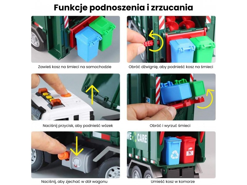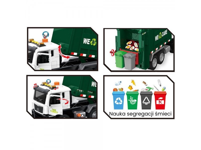 Dėl realistiškų funkcijų ir edukacinių priedų ši šiukšliavežė taps ne tik mėgstamiausiu žaislu, bet ir naudinga priemone mokantis kasdienių ekologinių įpročių.