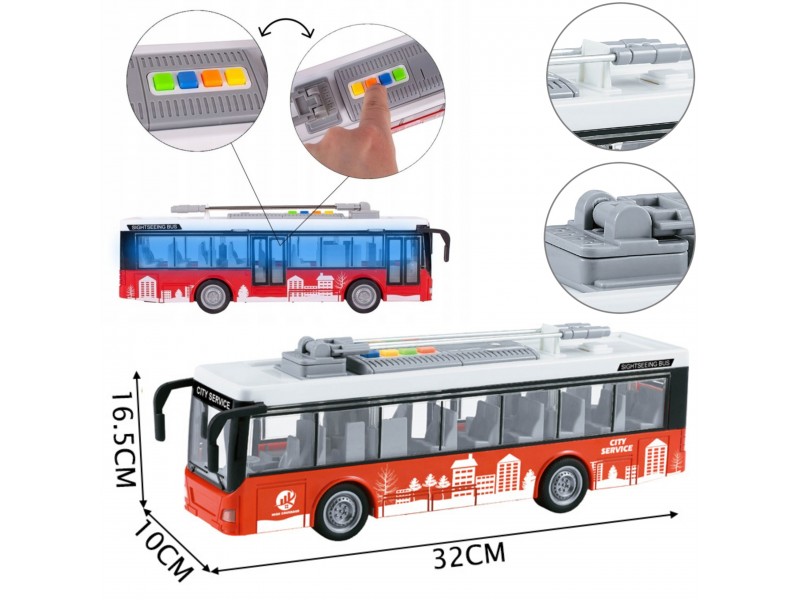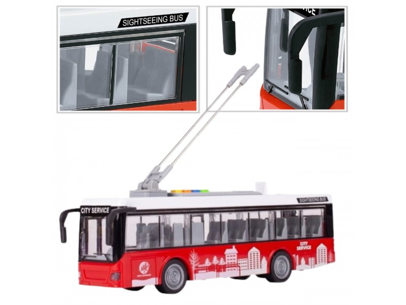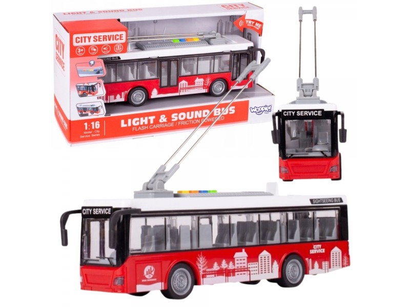 Didelis džiaugsmas mažiesiems viešojo transporto gerbėjams! Realistinis WOOPIE prekės ženklo miesto troleibuso modelis yra puikus žaislas vaikams, kurie mėgsta transporto priemones ir vaidmenų žaidimus. Ši transporto priemonė turi daug integruotų funkcijų, kurios neleis nuobodžiauti. Troleibusas aprūpintas garso efektais, vidaus apšvietimu, judančiais pantografais (srovės ėmikliais) bei atidaromomis durimis. Žaislas turi keturis guminius ratus ir frikcinę pavarą. Tiesiog pastumkite jį į priekį arba atgal, ir jis pats nuvažiuos kelis metrus tiesia linija.