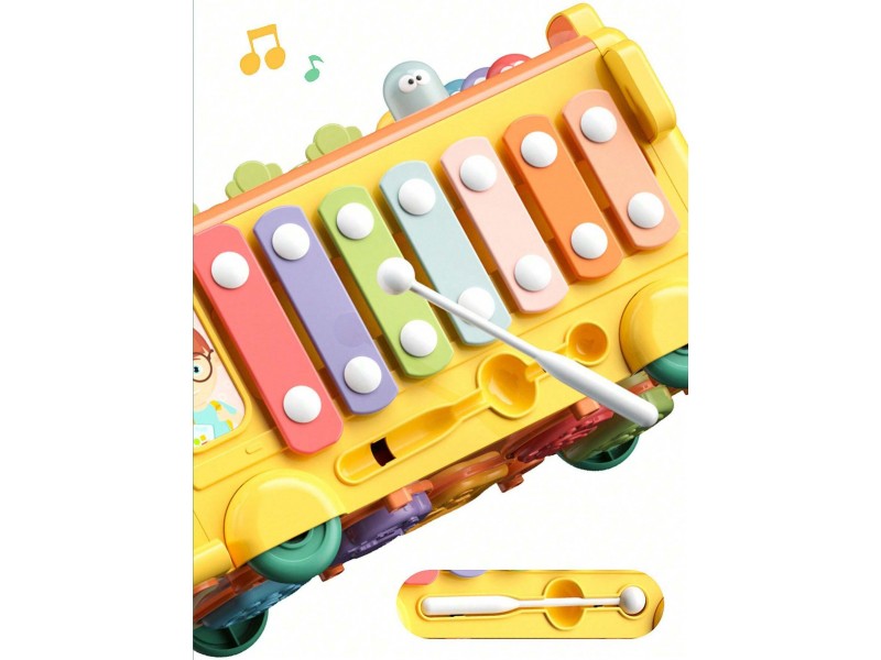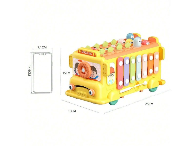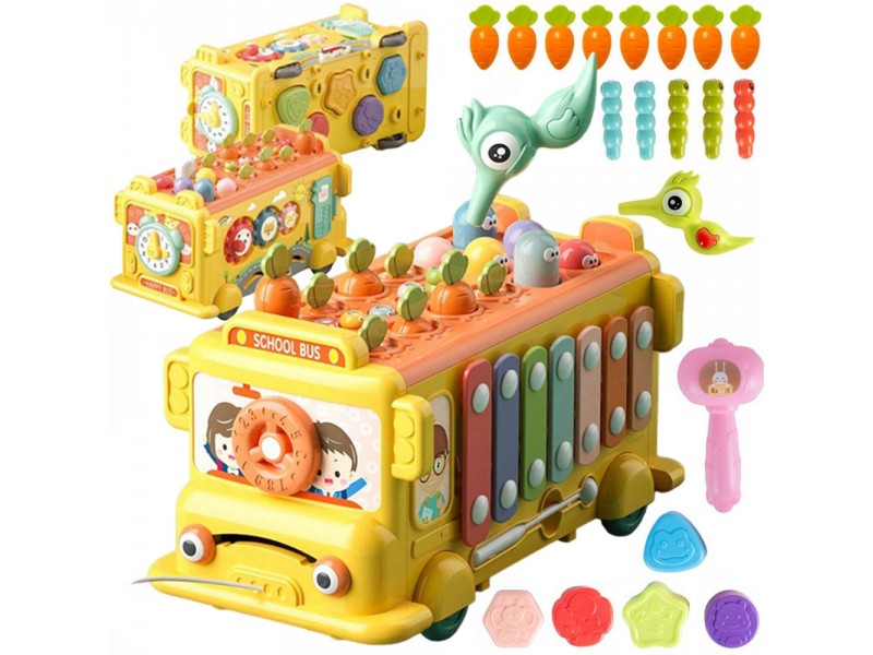 Judantys, įvairiaspalviai elementai ant šoninės transporto priemonės sienelės užtikrina nesibaigiančias pramogas ir teigiamai veikia motorinių įgūdžių vystymąsi. Ant stogo yra matomi spalvoti, judantys elementai, kuriuos vaikas gali pakaitomis įspausti, mušdamas į juos rinkinyje esančiu plaktuku. Spalvoti cimbolai, esantys ant autobuso šono, supažindins jūsų vaiką su magišku garsų pasauliu. Autobusiukas turi virvutę, kurios dėka jūsų vaikas galės pasiimti savo mėgstamą žaislą į bet kurią vietą. Šis spalvingas autobusiukas suteiks daugybę valandų pramogų, kartu teigiamai veikdamas jūsų mažylio motorikos, regos ir klausos vystymąsi.