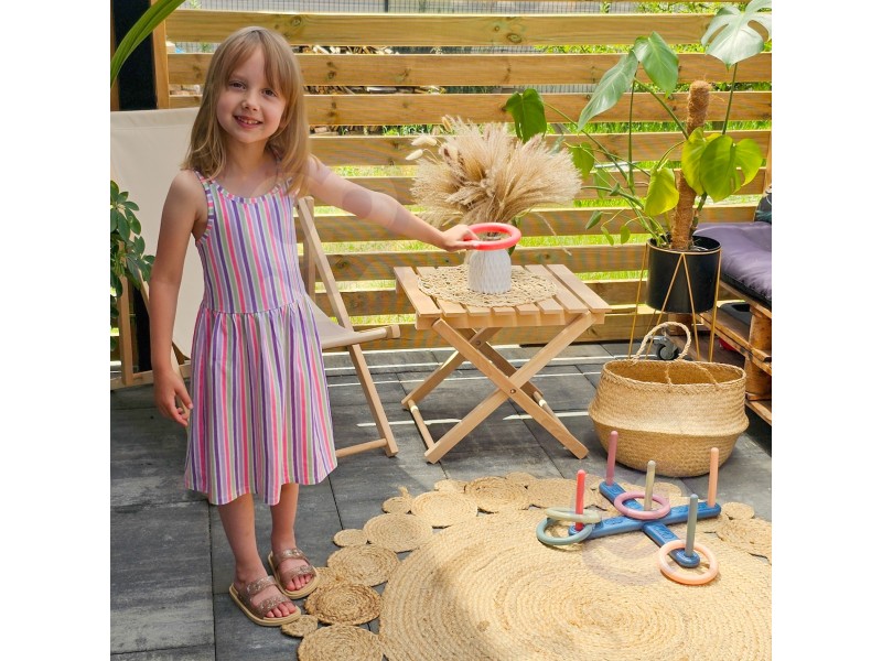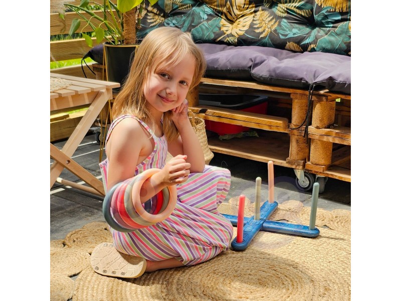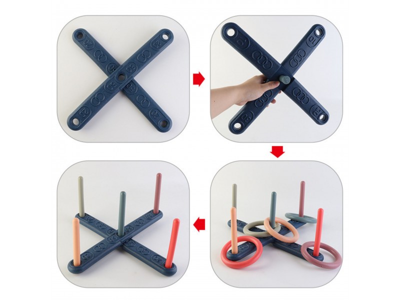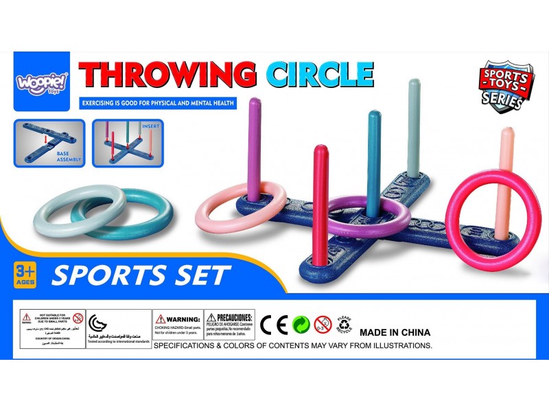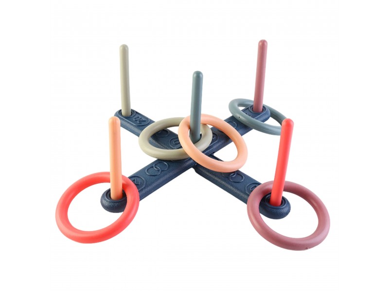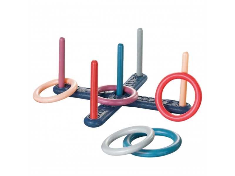 - Rinkinio turinys: 5 mėtymo žiedai, 5 skirtingų spalvų kuoliukai.