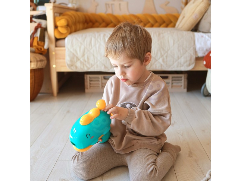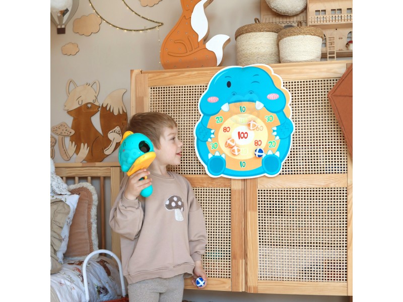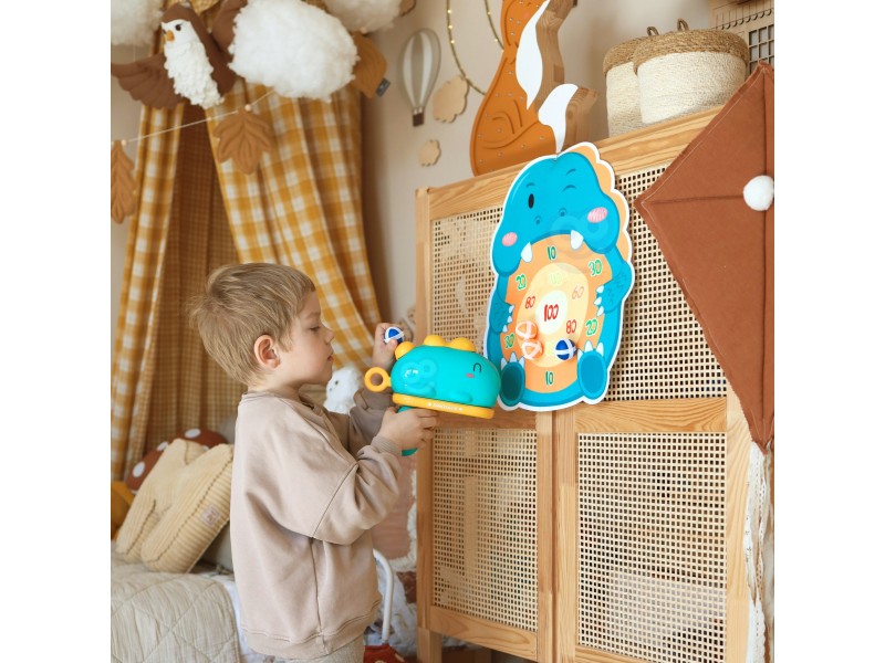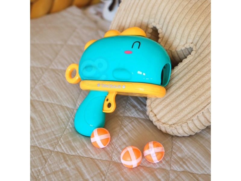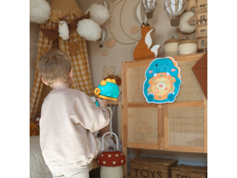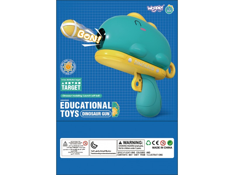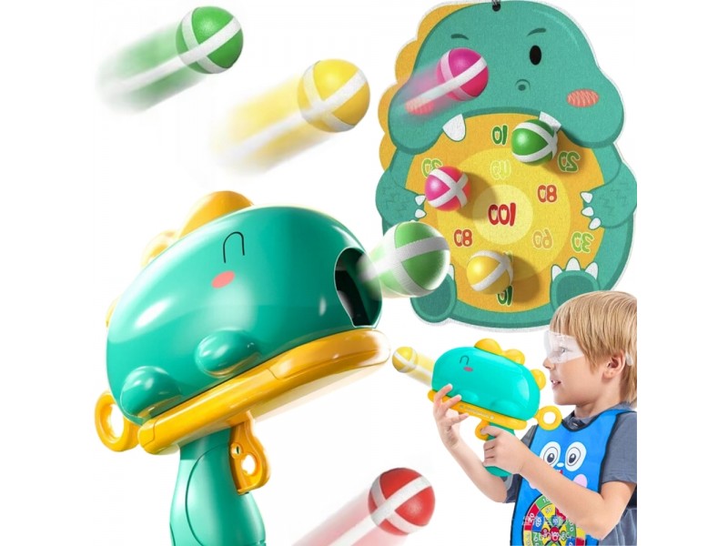 Prekės ženklo WOOPIE pistoletas su kamuoliukais, skirtas šaudymo į taikinį žaidimams, pasižymi priešistorinių roplių stilistika, todėl puikiai tiks visiems dinozaurų gerbėjams. Dinozauro formos pistoletą pakanka užtaisyti kamuoliukais, patraukti užtaisymo svirtį, o tada nusitaikyti į taikinį ir šauti. Taikinys yra lengvas ir nešiojamas, todėl žaisti galima bet kur – tiek namuose, tiek lauke. Taikinys turi kabliuką tvirtinimui, todėl jį lengva pakabinti ant įvairių paviršių, o baigus žaidimą – greitai sulankstyti ir padėti į vietą, taip palaikant tvarką. Rinkinyje yra 6 įvairiaspalviai kamuoliukai. Žaidimas puikiai lavins pačių mažiausiųjų motorinius įgūdžius ir koordinaciją, o vyresniems suteiks varžybų dvasios. Taikinys su pažymėtomis taškų zonomis suteikia varžymosi elementą – patikrinkite, kas jūsų šeimoje ar draugų rate taps taiklumo meistru.