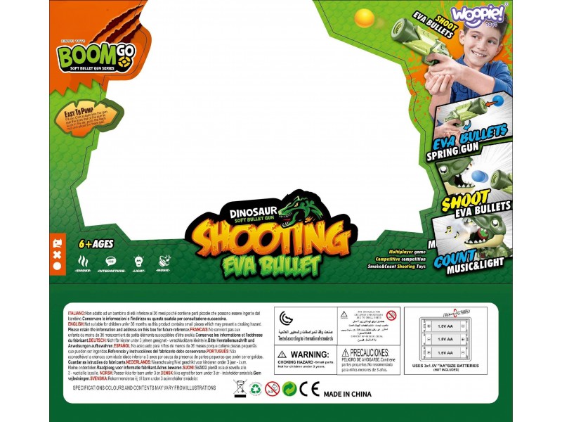 Prekės ženklo WOOPIE interaktyvi kamuoliukų šaudyklė yra inovatyvus ir jaudinantis žaislas, kuris suteiks nepamirštamų pramogų ir skatins įvairaus amžiaus vaikų aktyvumą. Šiame rinkinyje yra viskas, ko reikia, kad vaikas įsijaustų į tikro herojaus ar specialiojo agento vaidmenį, ginantį savo miestą nuo dinozauro grėsmės! Putplasčio kamuoliukų šautuvas yra žaislas, leidžiantis šaudyti minkštais kamuoliukais nenaudojant baterijų. Tiesiog įdėkite putplasčio kamuoliukus į vamzdį, o oro pasipriešinimas pats išstums juos į priekį.