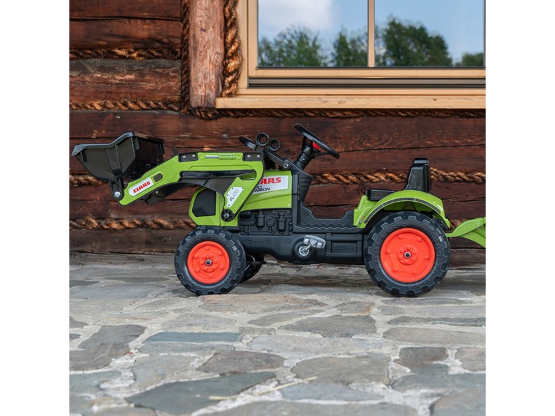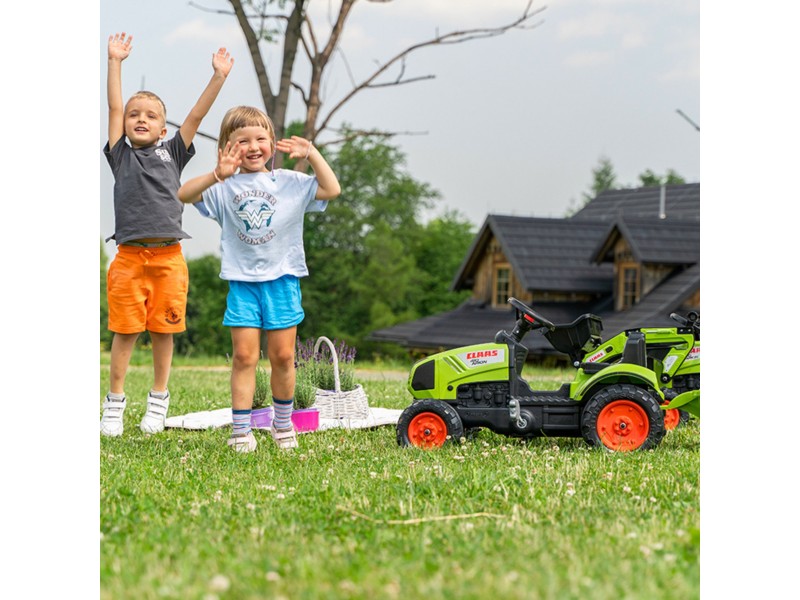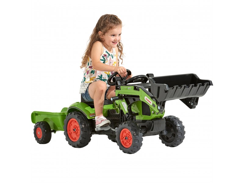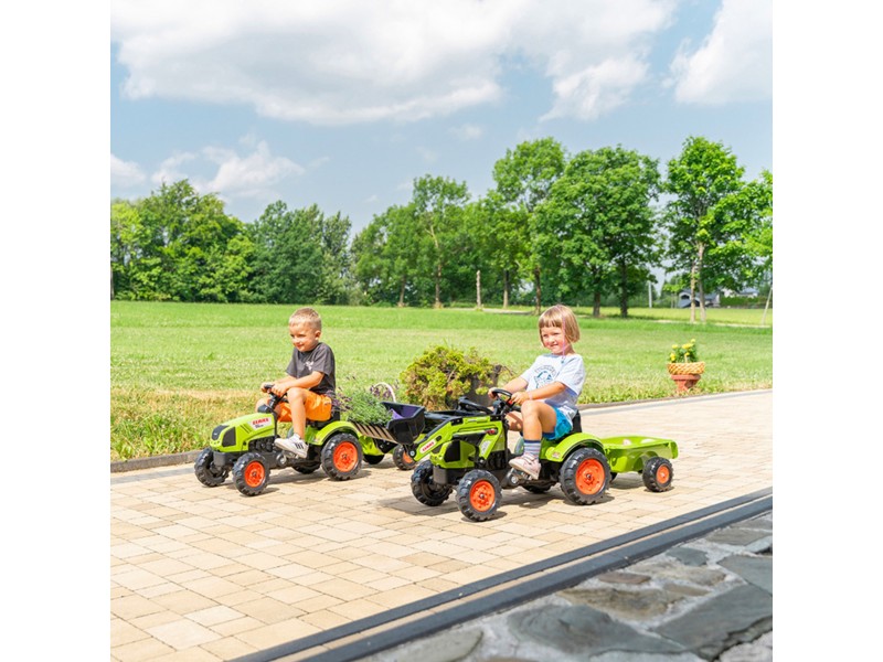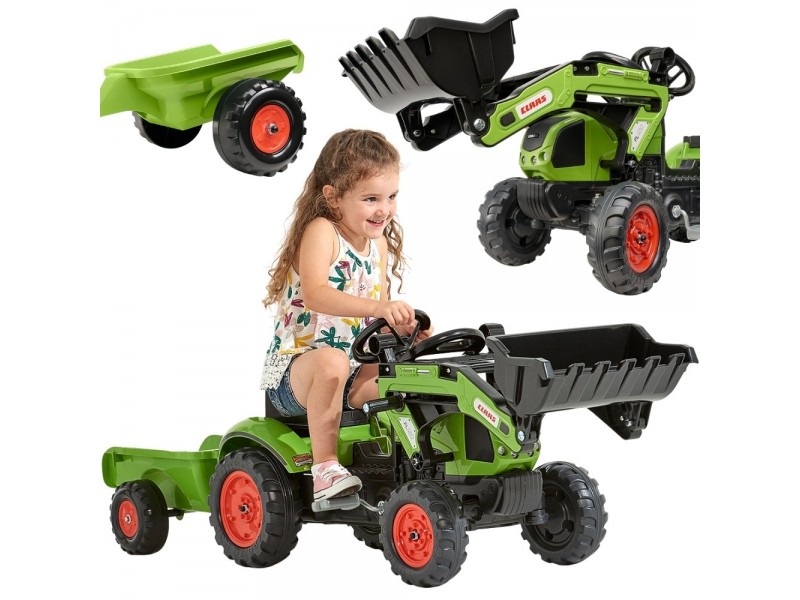 Specialiai mažiesiems sodininkams nuo 2 iki 5 metų sukurtas FALK prekės ženklo traktorius su priekaba yra tiksli „Claas Arion 410“ modelio su pedalais replika. Akimirksniu galima prijungti priekabą, kad būtų galima pakrauti ir pervežti smėlį, lapus, žemę bei akmenis iš vieno sodo galo į kitą. Transporto priemonė pagaminta Prancūzijoje, o mažiausiai 70 % jos sudaro perdirbtas plastikas. Manevravimą palengvina patogus vairas su įmontuotu garso signalu, garantuojantis begalę valandų puikios pramogos gryname ore.