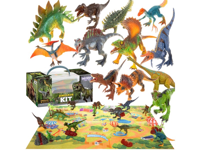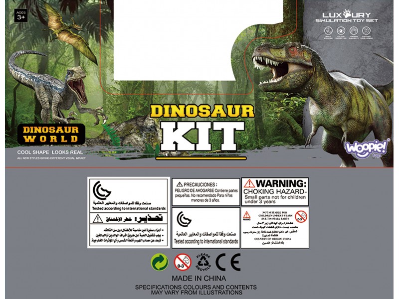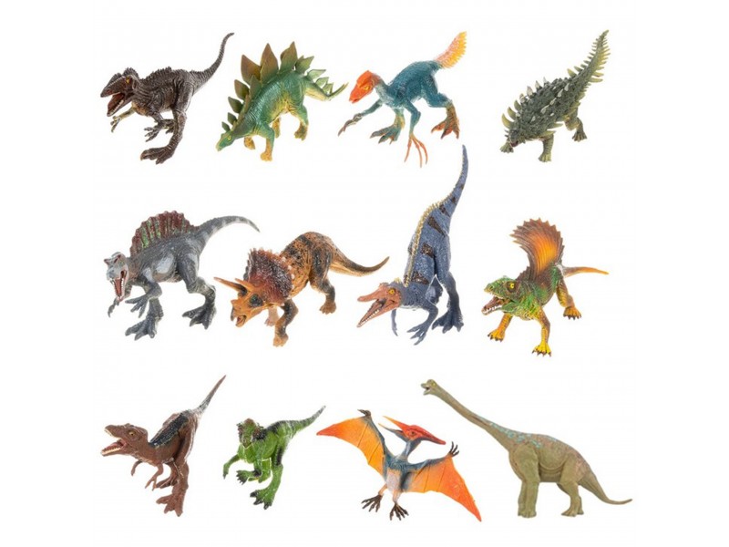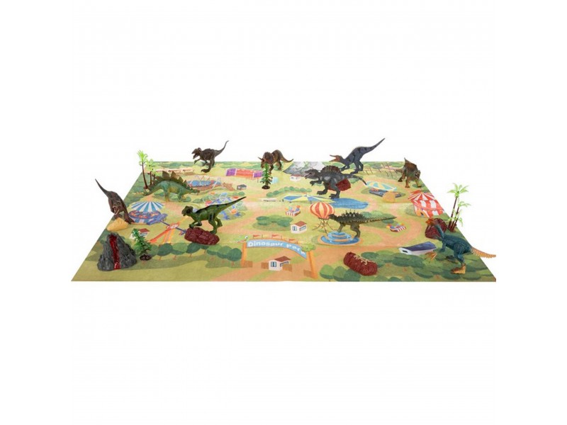 - 12 dinozaurų figūrėlių: Tiranozauras (Tyrannosaurus Rex), Ankilozauras, Dilofozauras, Triceratopsas, Lezotozauras, Brontozauras, 2x Spinozauras, Tarbozauras, Iguanodonas, Pteranodonas.