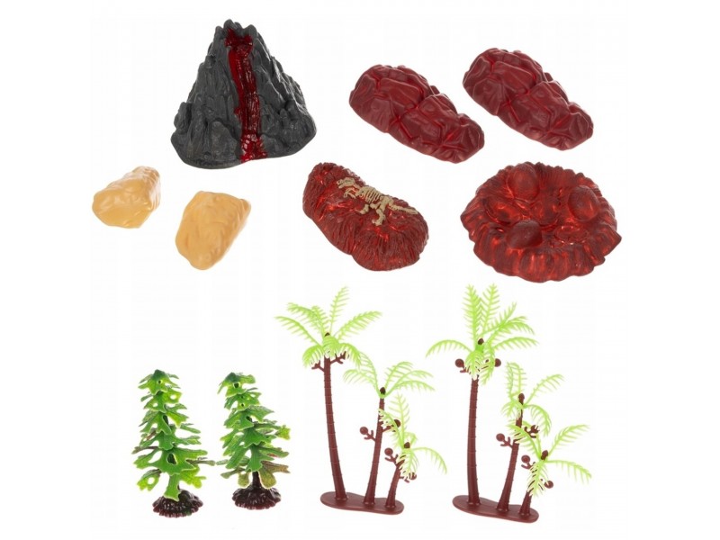 - 7 kiti priedai: lava, lizdas su dinozaurų kiaušiniais, akmenys.