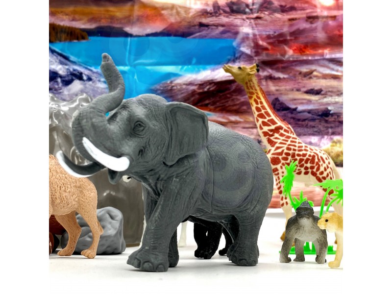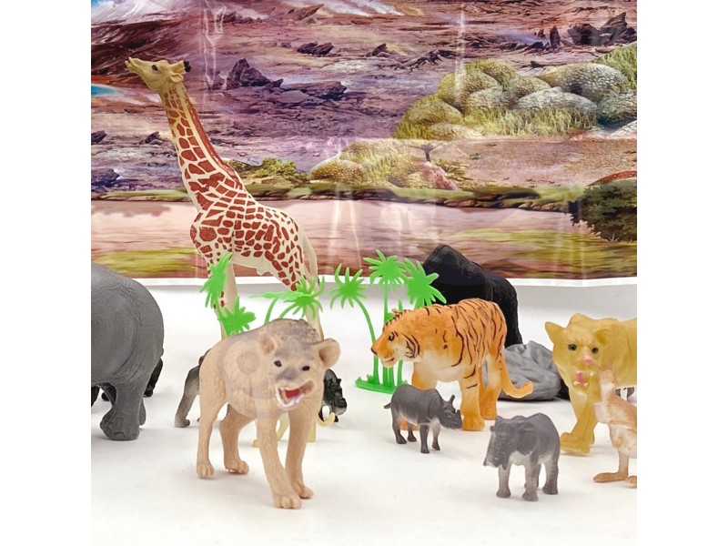 - Safario gyvūnų figūrėlės ir teminis žemėlapis.