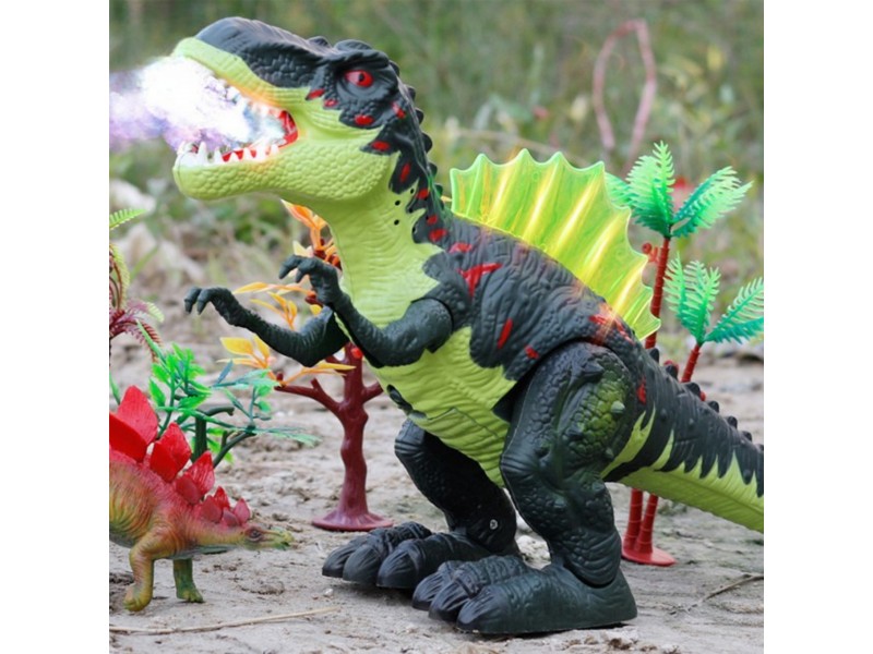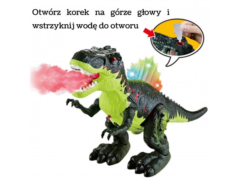 • Dinozauras eina į priekį, judina letenas ir „kvepuoja ugnimi“ (saugus garų efektas).