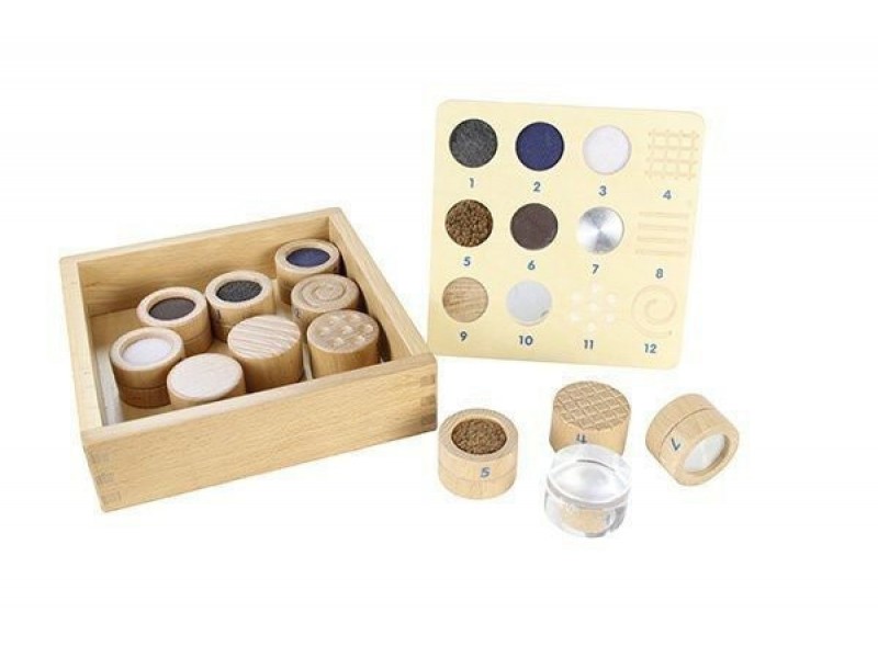 - Rinkinį sudaro 12 kaladėlių: 7 su skirtingomis medžiagomis ir 5 su skirtingomis faktūromis.