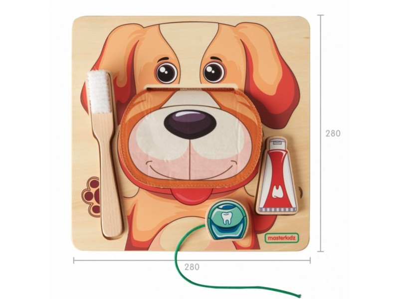 Ši inovatyvi Masterkidz edukacinė lenta paverčia dantų valymą smagiu žaidimu! Ji supažindina vaikus su burnos higienos svarba per interaktyvią veiklą. Lentoje pavaizduotas mielas šuniukas, kuris gali atverti burną, atidengdamas 10 dantukų. Komplekte rasite viską, ko reikia mažajam odontologui: žaislinę dantų pastą, šepetėlį ir dantų siūlą. Vaikai gali mėgdžioti suaugusiuosius valydami šuniuko dantis – spausdami pastą, šveisdami šepetėliu ir naudodami siūlą. Tai ne tik lavina jų smulkiąją motoriką ir judesių tikslumą, bet ir skatina pokalbius apie asmeninės higienos svarbą. Žaislas puikiai tinka žaisti tiek vienam, tiek poroje.