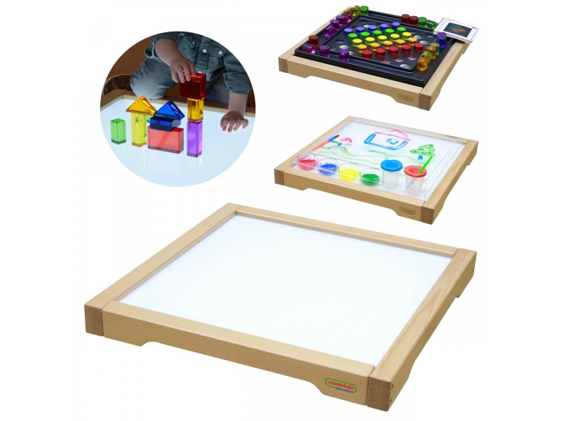Tvirta, medinė šviesos dėžė su balta LED šviesa iš garsiosios Masterkidz kompanijos. Šis šviesos stalas atveria neribotas galimybes kūrybiškumui ir mokymuisi pagal STEM metodiką – vaikai gali tyrinėti spalvų maišymą, stebėti šviesos sklidimą per įvairias medžiagas, tokias kaip lapai, popierius ar smėlis. Ypač įspūdingi efektai išgaunami naudojant kartu su Masterkidz kvadratiniu smėlio padėklu ar skaidriu vandens padėklu, taip sukuriant magišką žaidimų aplinką.