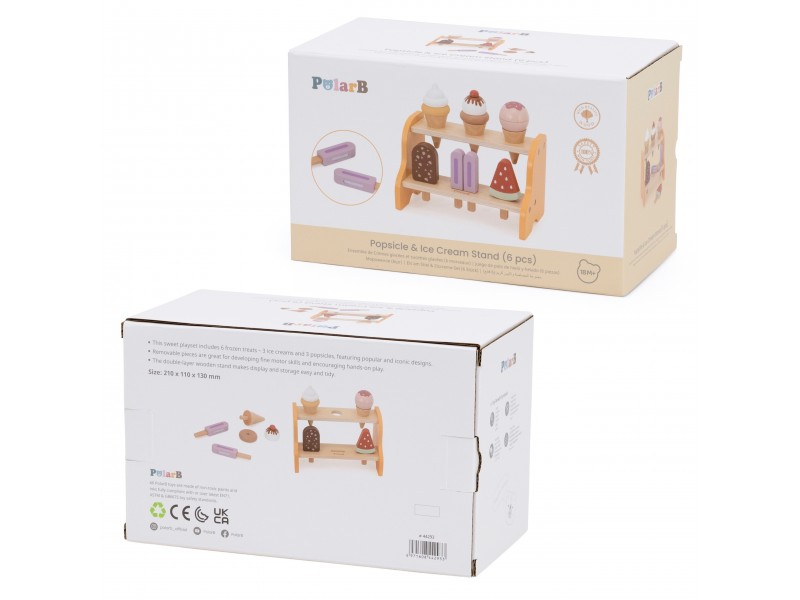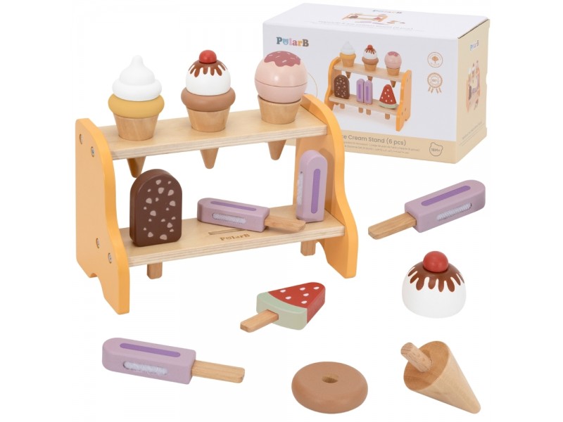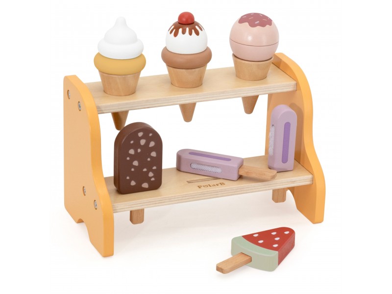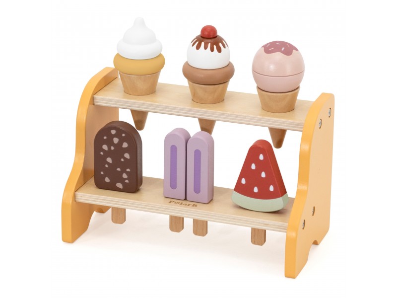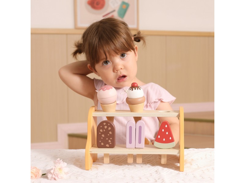 Šis žavingas Viga rinkinys kviečia vaikus pasinerti į saldų vaidmenų žaidimų pasaulį! Jame rasite 6 spalvingus medinius ledus – 3 vaflių rageliuose ir 3 ant pagaliuko – kurie džiugins kiekvieną mažąjį smaližių. Dviejų aukštų medinis stovas ne tik leidžia gražiai eksponuoti skanėstus, bet ir padeda palaikyti tvarką žaidimo metu. Išimami ledai skatina smulkiąją motoriką ir lavina lytėjimo pojūčius, o visas komplektas idealiai tinka kūrybingiems žaidimams, pavyzdžiui, įsivaizduojant savo ledų parduotuvėlę!
