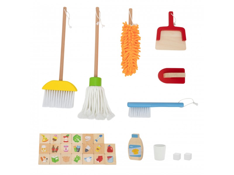 - 5 valymo įrankiai (šluota, šluostė, šepetys, semtuvėlis su šluotele).