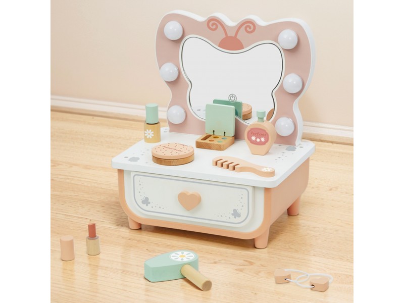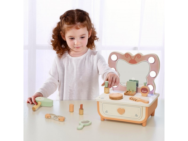Pakvieskite savo mažąją princesę į grožio ir priežiūros pasaulį su mediniu Tooky Toy kosmetiniu staliuku, kuris sujungia stilių, saugumą ir begalines žaidimo galimybes. Rinkinys su apšviečiamu veidrodžiu, mediniais kosmetikos imitacijos priedais ir aksesuarais perkelia vaikus į makiažo ir grožio pasaulį pačiu žavingiausiu būdu. Elegantiškos pastelinės spalvos sukuria aplinką, kuri ne tik įkvepia žaidimams, bet ir puikiai dera prie bet kurio vaiko kambario interjero.