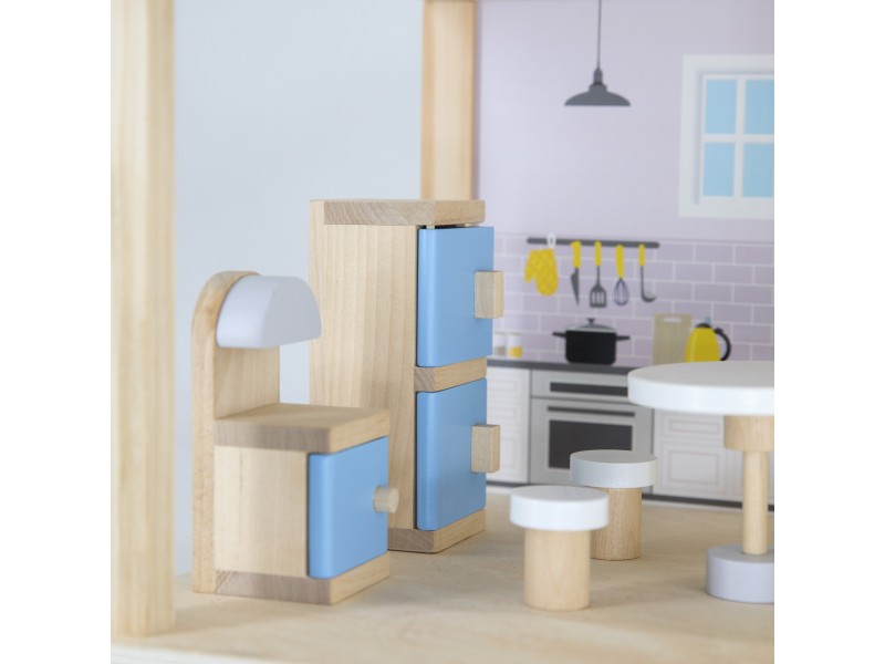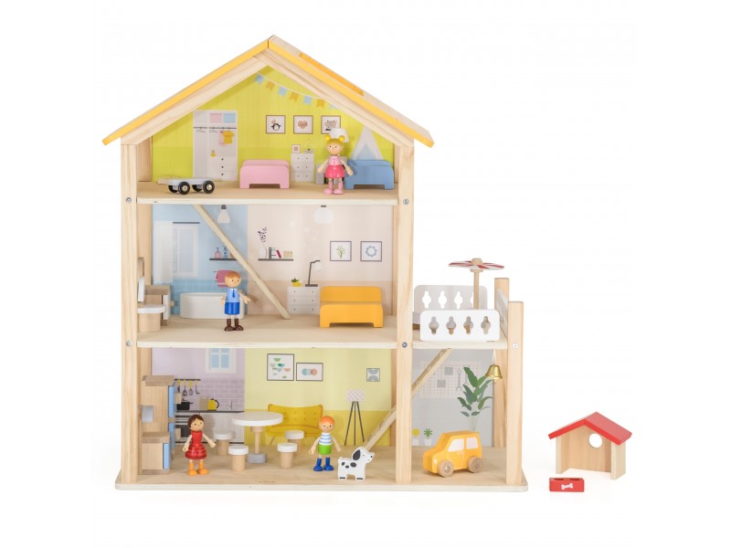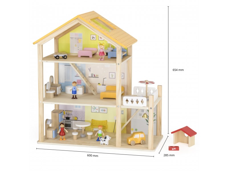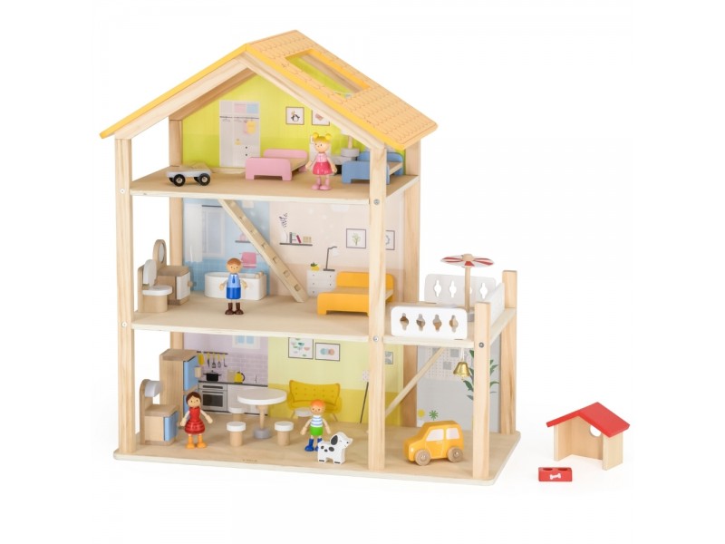 Didelis medinis lėlių namelis iš Viga „PolarB“ serijos – tai svajonių žaislas, pagamintas iš aukščiausios kokybės natūralių medžiagų, kuris neabejotinai sužavės jūsų vaiką! Namelis yra pilnai apstatytas baldais ir gausus įvairiausių priedų. Jūsų mažylis čia ras viską, ko reikia norint susikurti savo pasakų pasaulį: virtuvę, svetainę, vonios kambarį, jaukų miegamąjį, vaiko kambarį, garažą, balkoną ir netgi būdą šuniukui! Kiekvienas kambarys yra kruopščiai suprojektuotas ir apstatytas atitinkamais baldais bei aksesuarais. Šis rinkinys skatina kūrybišką žaidimą, lavina vaizduotę ir socialinius įgūdžius.