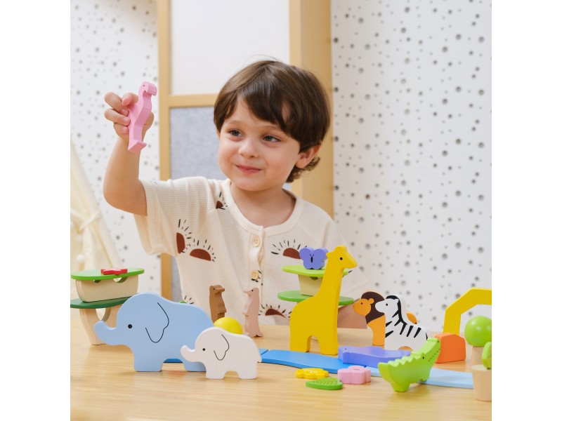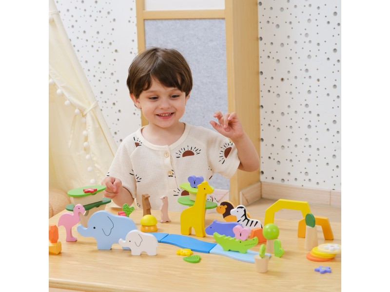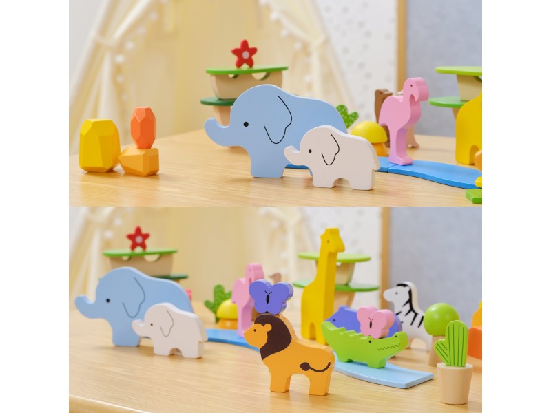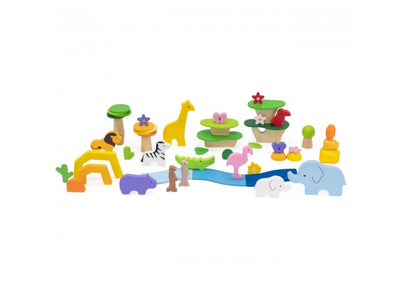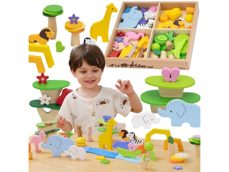 Leiskitės į nepamirštamą nuotykį po Afrikos savaną su VIGA „Spalvotų tropikų pasakų“ kaladėlių rinkiniu! Šis išskirtinai gausus, 55 medinių, laisvai derinamų elementų komplektas yra tikras atradimas, įkvėptas Montessori pedagogikos, skatinantis laisvą žaidimą ir mokymąsi. Savanos gyvūnų figūrėlės – dramblys, žirafa, liūtas ir zebras – bei atogrąžų augmenijos ir upės elementai įkvėps mažuosius kurti savo unikalius scenarijus ir lavinti beribę vaizduotę. Žaidimas su kaladėlėmis lavina smulkiąją motoriką bei gebėjimą susikaupti, o patogios medinės dėžutės su skyreliais dėka, žaislų tvarkymas taps ne mažiau smagia žaidimo dalimi.