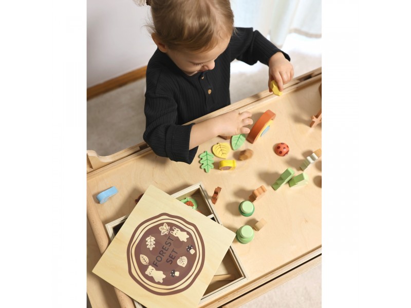 Visas rinkinys yra laikomas patogioje medinėje dėžutėje. Ypatinga detalė – dėžutės dangtelis, kurio kita pusė veikia kaip kreidinė lenta, suteikianti dar daugiau erdvės vaiko saviraiškai.