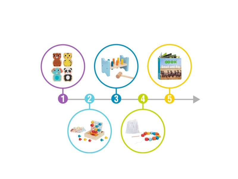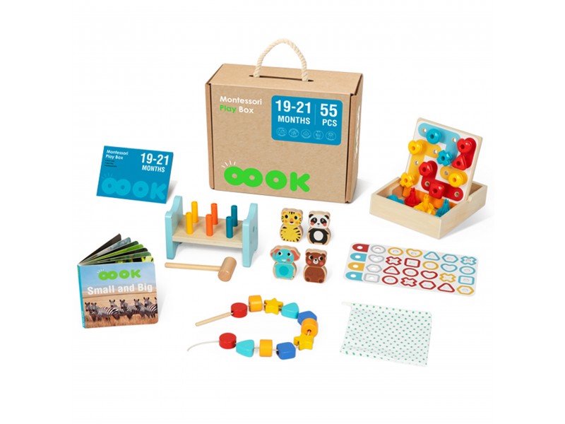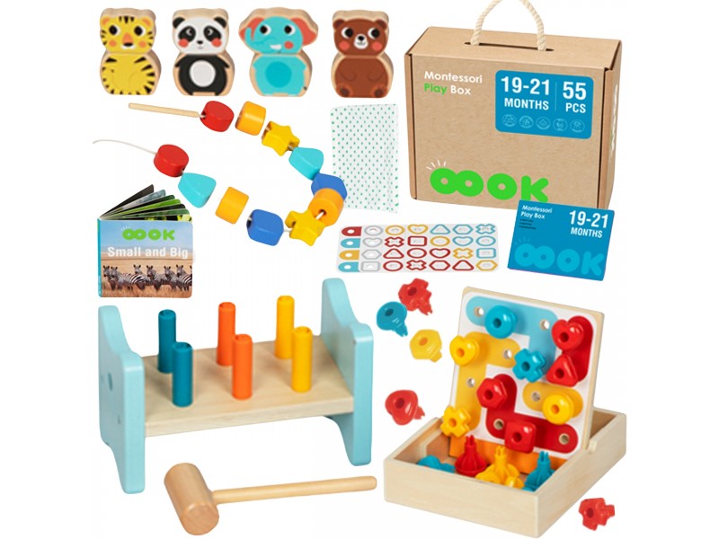 "Tooky Toy" pristato edukacinį Montessori žaislų rinkinį. Ši medinių žaislų kolekcija skirta vaikams nuo 19 iki 21 mėnesių amžiaus. Rinkinyje rasite 6 skirtingus lavinamuosius žaidimus ir žaislus, kurie neabejotinai sudomins jūsų mažylį. Tokia dėžutė – tai puikus būdas ugdyti mažylių pažintinius, emocinius ir motorinius įgūdžius! Komplekte yra instrukcija, kurioje pateikiama informacija apie dėžutės turinį, žaislų naudojimo instrukcijos bei naudingi patarimai tėvams.