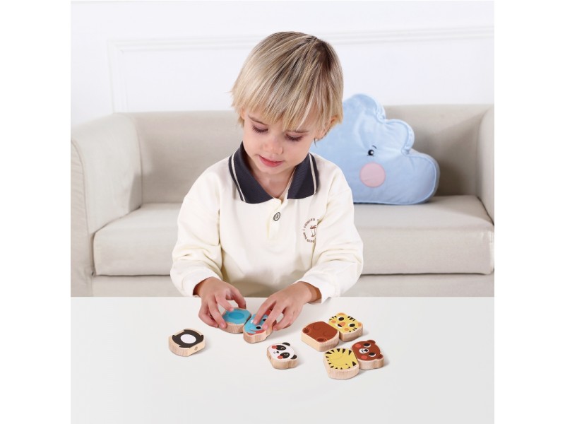 Tai medinių dėlionių rinkinys su magnetais, vaizduojantis įvairius gyvūnus: lokį, tigrą, dramblį ir pandą. Dėlionės pagamintos iš didelių kaladėlių, kurios yra pakankamai stambios, kad jų nebūtų galima praryti, ir patogios suimti. Kraštai yra švelniai nupoliruoti ir užapvalinti, todėl nesužeis mažų vaiko rankyčių. Magnetai yra įmontuoti viduje, todėl nėra pavojaus, kad jie atsiklijuos dėliojant, o žaidimas tampa dar įdomesnis. Kiekvienas gyvūnas padalintas į dvi dalis, o vaikai turi pasitelkti savo rankų miklumą, kad sugrąžintų jiems pradinę formą! Dėliodami jas poromis (viena galva ir vienas kūnas), vaikai ugdo motorinius gebėjimus ir vaizduotę, lavina rankų įgūdžius bei akių-rankų koordinaciją.