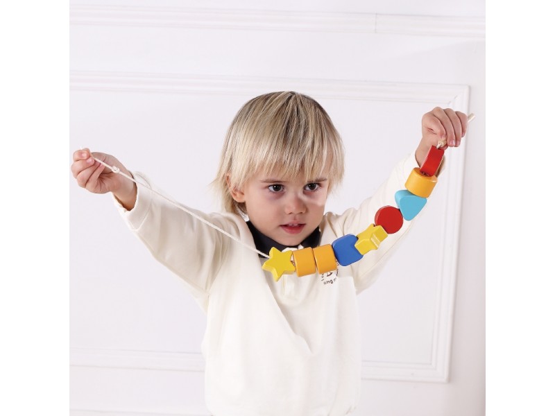 Rinkinį sudaro 1 maišelis laikymui, 11 skirtingų formų kaladėlių ir 1 virvelė vėrimui. Tai klasikinis medinių kaladėlių rinkinis su skylutėmis, per kurias vaikas veria virvelę. Tai smagus užsiėmimas, kuris stimuliuoja smegenų veiklą ir lavina manualinius įgūdžius – smulkiąją motoriką, pirštų miklumą ir akių-rankų koordinaciją. Rinkinys sukurtas taip, kad vaikai galėtų mokytis atpažinti formas ir spalvas.