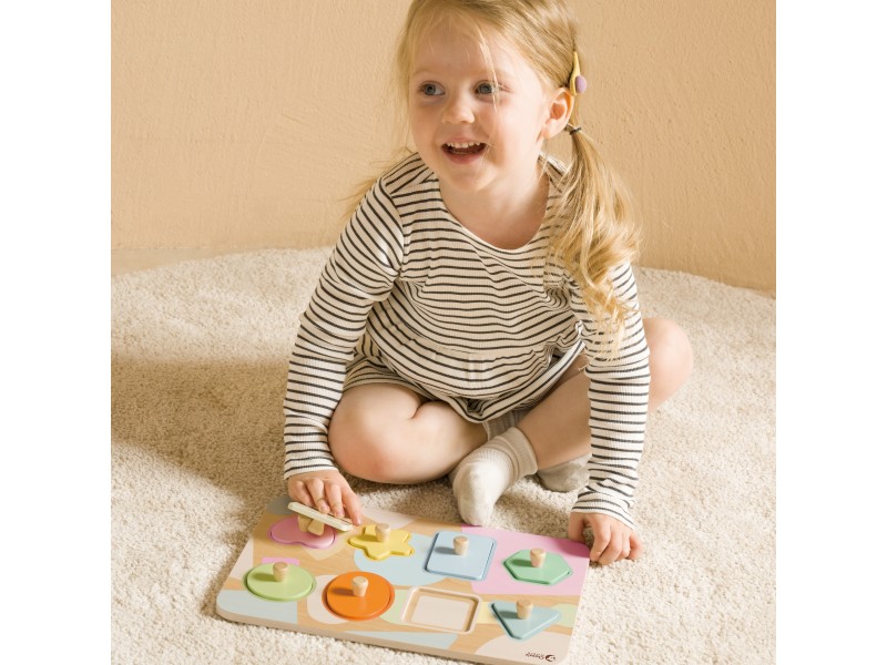 Medinė geometrinė dėlionė iš Classic World yra puikus lavinamasis žaislas, kuris supažindins jūsų vaiką su žaviu formų ir spalvų pasauliu. Šį rinkinį sudaro storas medinis pagrindas bei spalvingos detalės, kurias mažylis turi įstatyti į joms skirtas vietas. Dėl pastelinių spalvų žaislas ne tik patraukia dėmesį, bet ir tampa estetiška vaiko kambario interjero detale. Dėlionė sukurta taip, kad per žaidimą skatintų pažintinį vystymąsi, ragindama vaiką atpažinti geometrines figūras tiek vizualiai, tiek lytėjimu. Tvirta konstrukcija ir saugios medžiagos garantuoja, kad žaislas tarnaus ne vienerius metus.