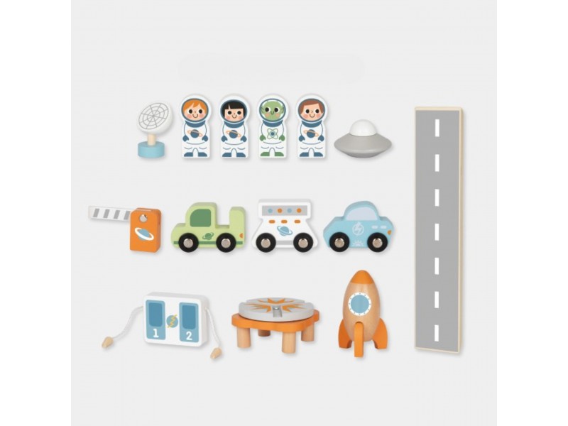 Stotis paruošta pakilimui – mažieji astronautai imasi veiksmų! Šis išskirtinis medinis rinkinis yra tikras džiaugsmas mažiesiems kosmoso tyrinėtojams. Kosminė stotis su daugybe lygių, rampomis, nusileidimo aikštele ir liftu užtikrina įdomų žaidimą ilgoms valandoms. Rinkinyje rasite ne tik stotį, bet ir transporto priemones, raketą, ateivį bei astronautus – viskas pagaminta kruopščiai, atsižvelgiant į detales ir vaikų saugumą.