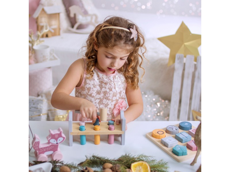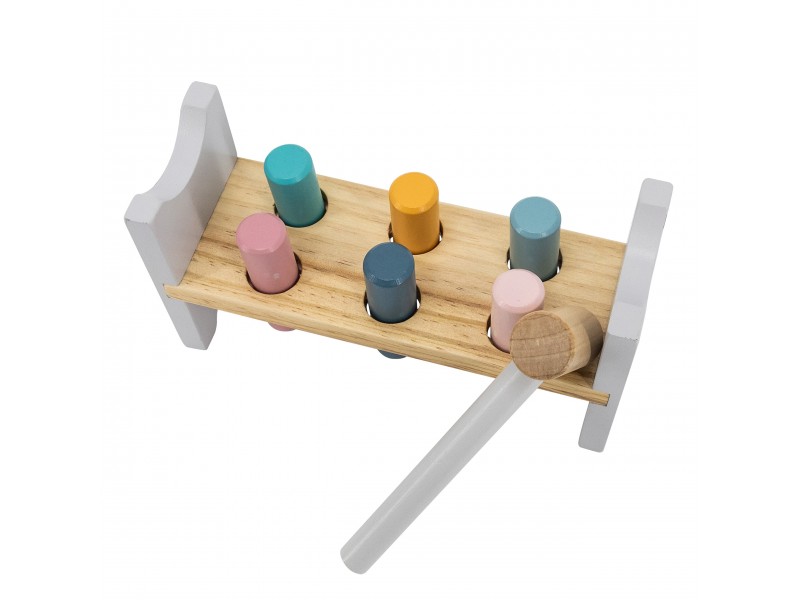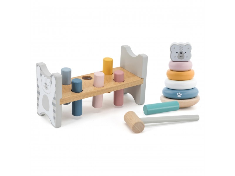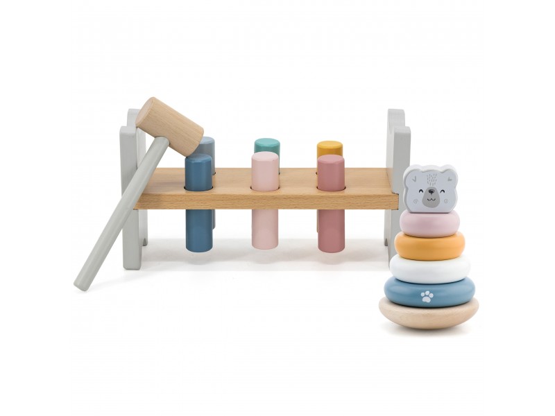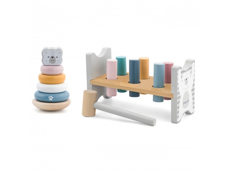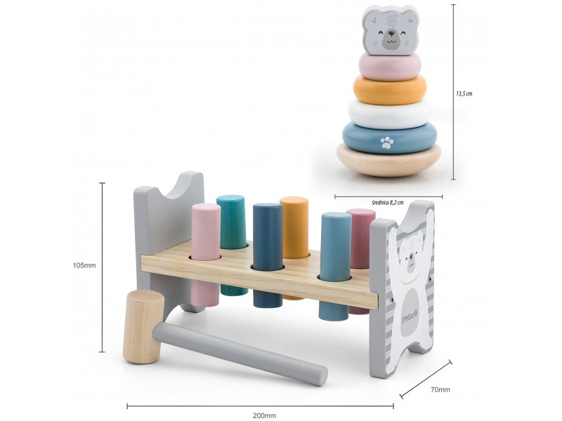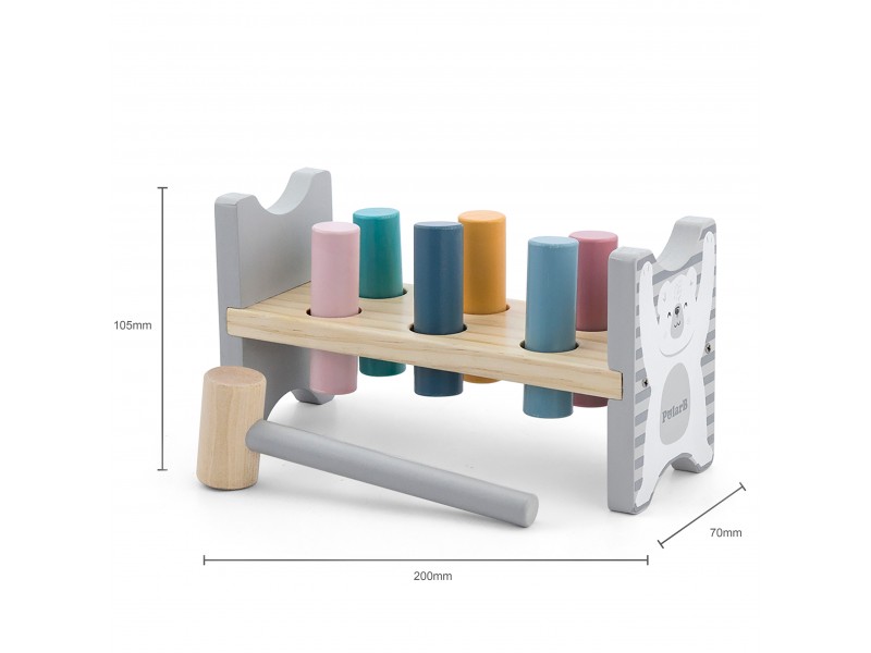 Šis „Viga PolarB“ serijos rinkinys – tai du nuostabūs, pastelinių spalvų mediniai žaislai viename: lavinamoji piramidė ir smagus kalimo žaidimas su plaktuku. Šie Montessori principais paremti žaislai ne tik suteiks vaikui daugybę džiaugsmo, bet ir taps svarbia priemone ugdant smulkiąją motoriką, loginį mąstymą bei mokantis pažinti spalvas. Žaidžiant lavinamas rankų judesių tikslumas, kuris yra be galo svarbus ateityje mokantis rašyti.