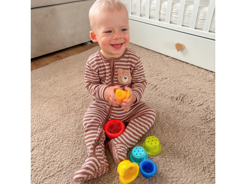- Sensorinius pojūčius – skirtingų tekstūrų ir formų žaislai stimuliuoja lytėjimo, regos ir klausos pojūčius.