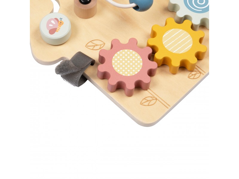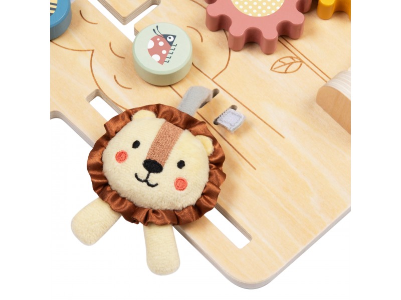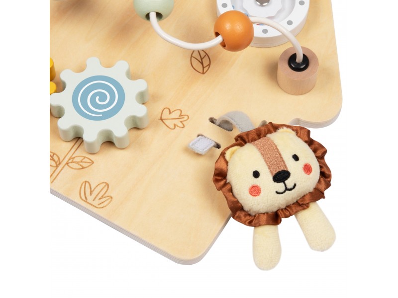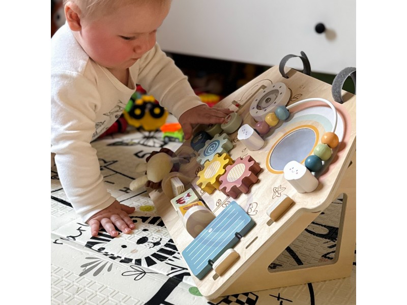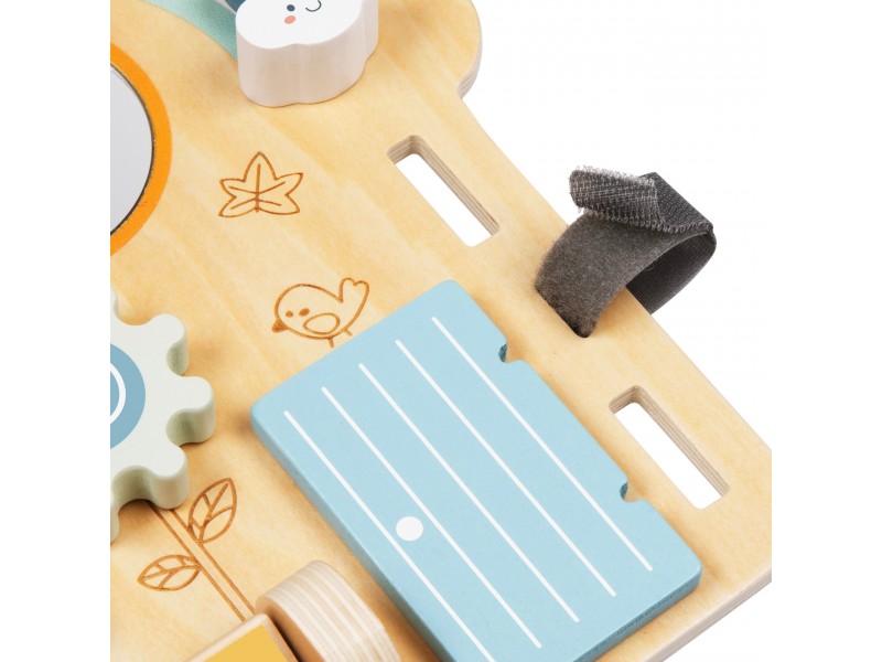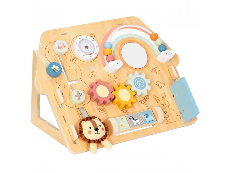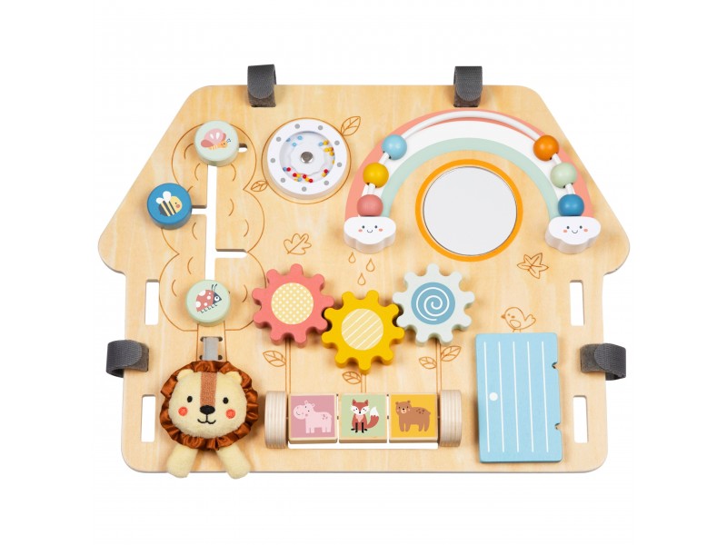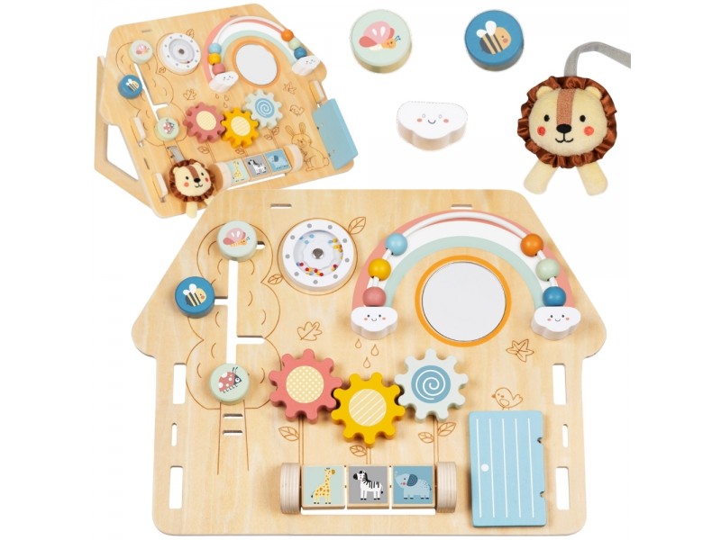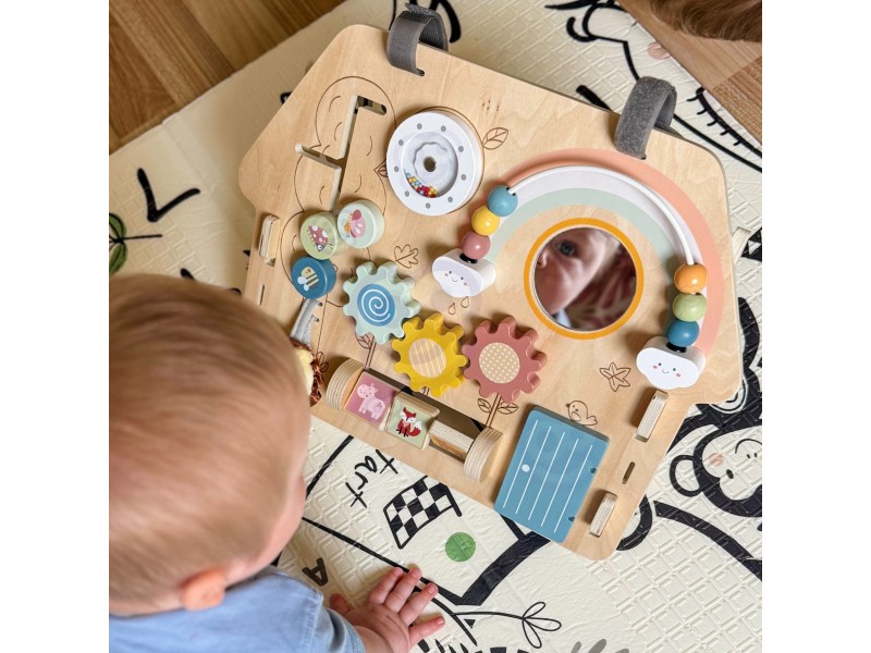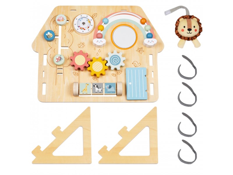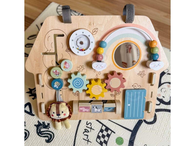 Medinė lavinamoji lenta „Namelis“ – tai edukacinė pramoga, skirta patiems mažiausiems. Šis namelio formos veiklos centras yra idealus žaislas pasauliu besidomintiems vaikams. Dėl įvairių interaktyvių elementų gausos, lenta lavina rankų įgūdžius ir palaiko vaiko sensorinį vystymąsi. Žaislas pagamintas iš aukštos kokybės medienos, todėl yra patvarus ir saugus mažyliams.