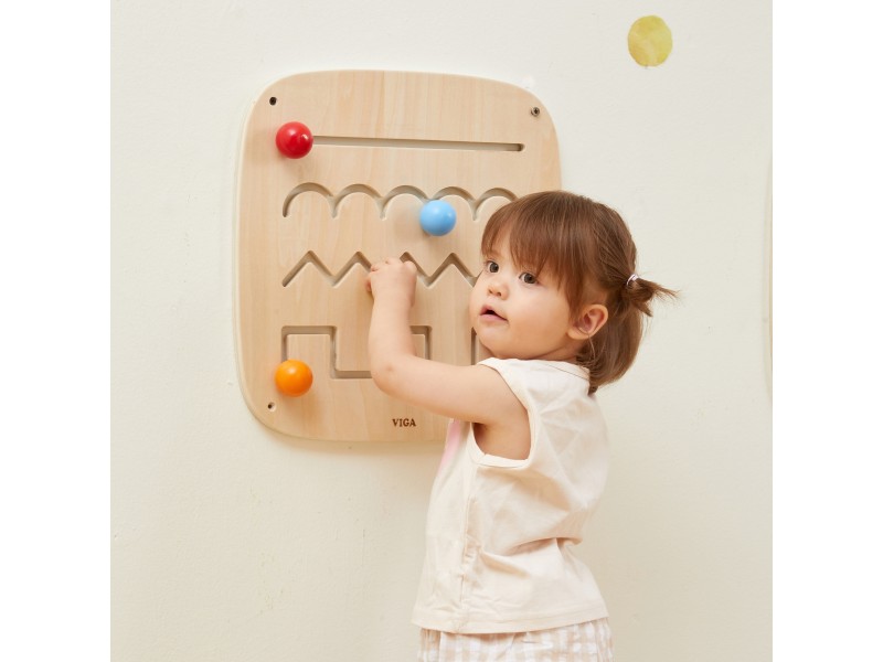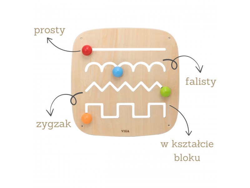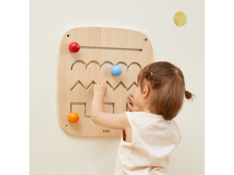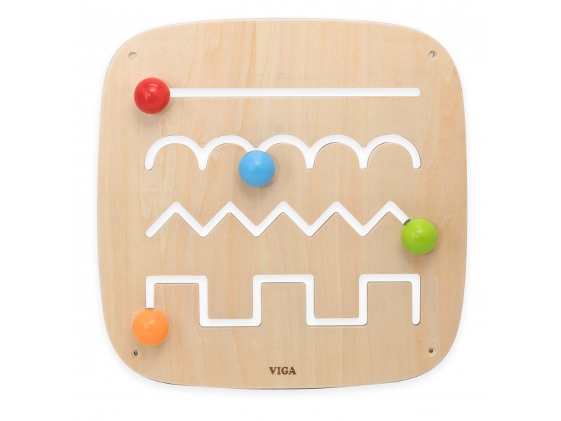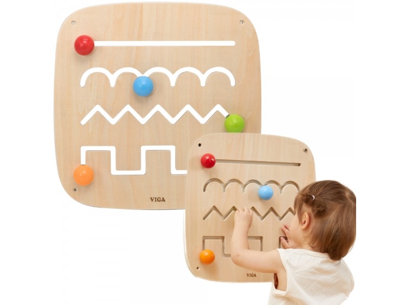 Ši medinė lavinamoji lenta yra ideali priemonė mokytis žaidžiant, sukurta specialiai mažyliams nuo 12 mėnesių amžiaus. Produktas padeda lavinti rankų ir akių koordinaciją bei smulkiąją motoriką, interaktyviu būdu supažindindamas vaikus su įvairių linijų ir formų pasauliu. Lentoje įrengti keturi takeliai su skirtingais raštais – tiesiu, banguotu, zigzago ir blokiniu. Prie kiekvieno takelio pritvirtintas spalvotas rutuliukas su patogia rankenėle, pritaikyta mažoms vaiko rankytėms. Stumdydami rutuliukus, vaikai atranda skirtingas linijų savybes, lavina spalvų atpažinimą ir mokosi tokių sąvokų kaip kampai ir kreivės. Lentą lengva pritvirtinti prie sienos, o jos tvirta medinė konstrukcija užtikrina ilgaamžiškumą ir saugumą žaidimų metu.