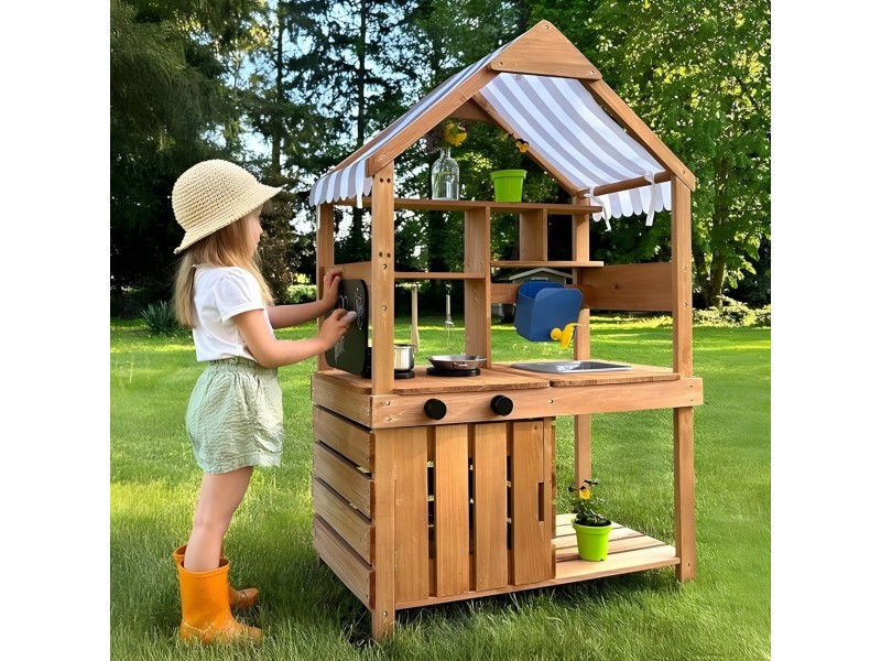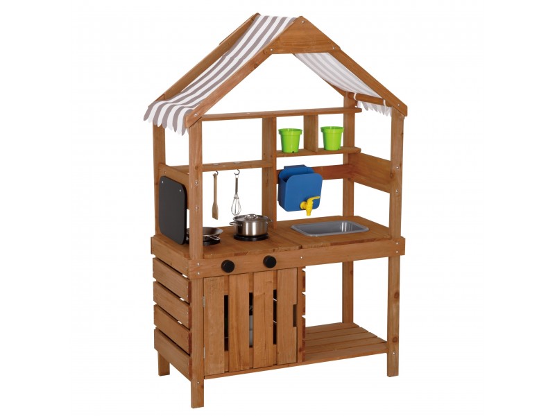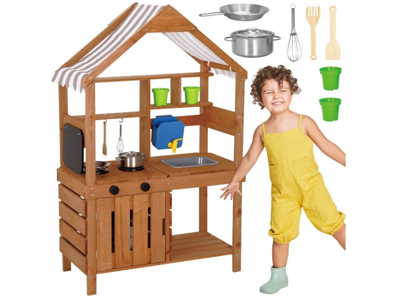 Medinė lauko virtuvėlė WOOPIE su stogeliu ir vandens kranu
