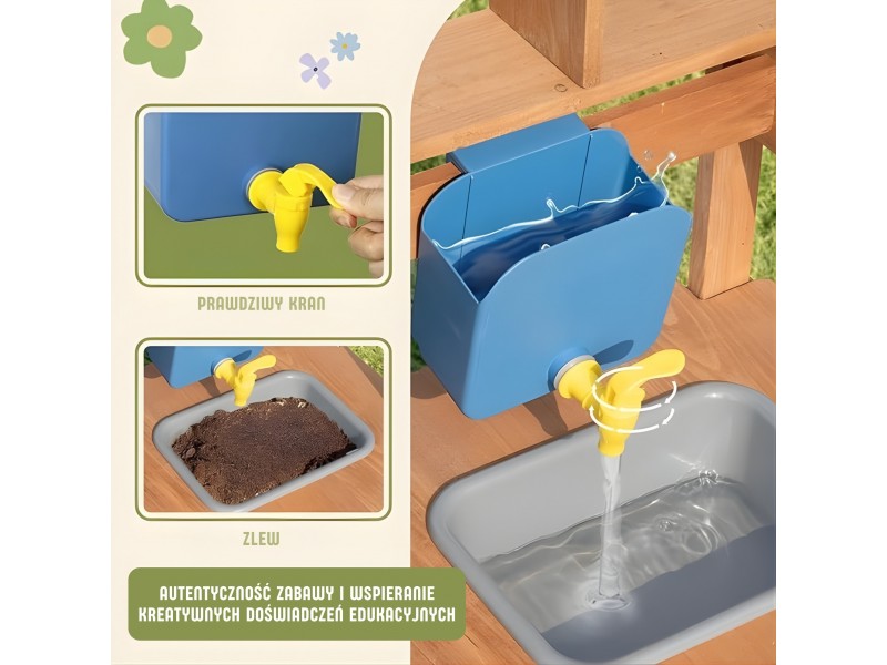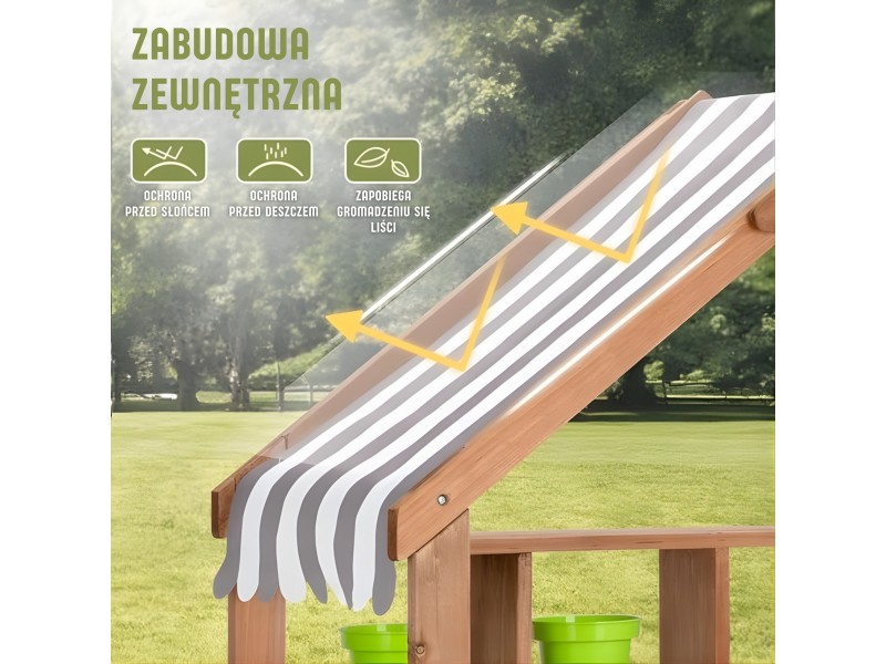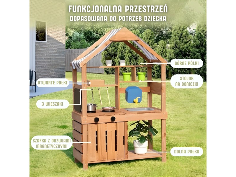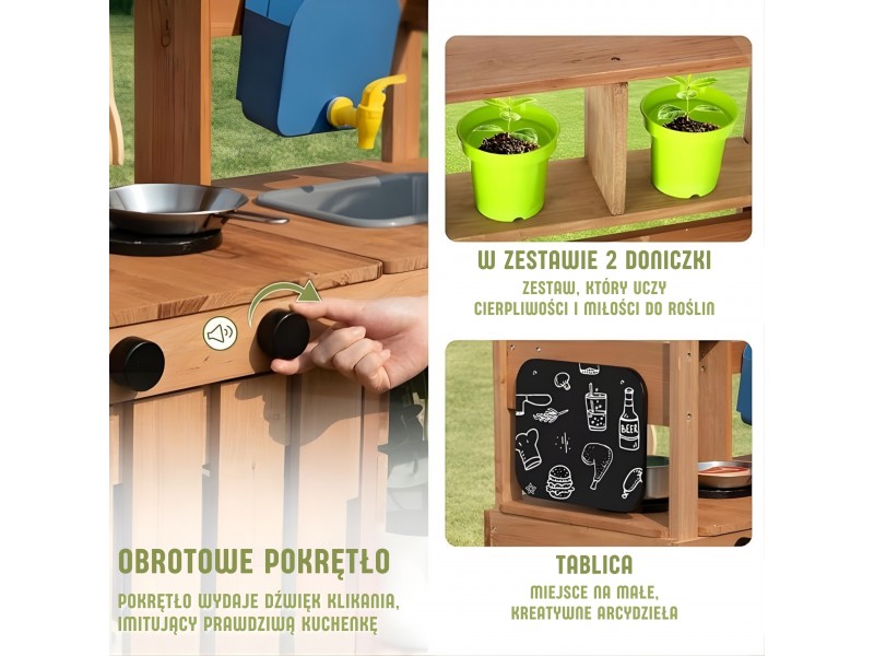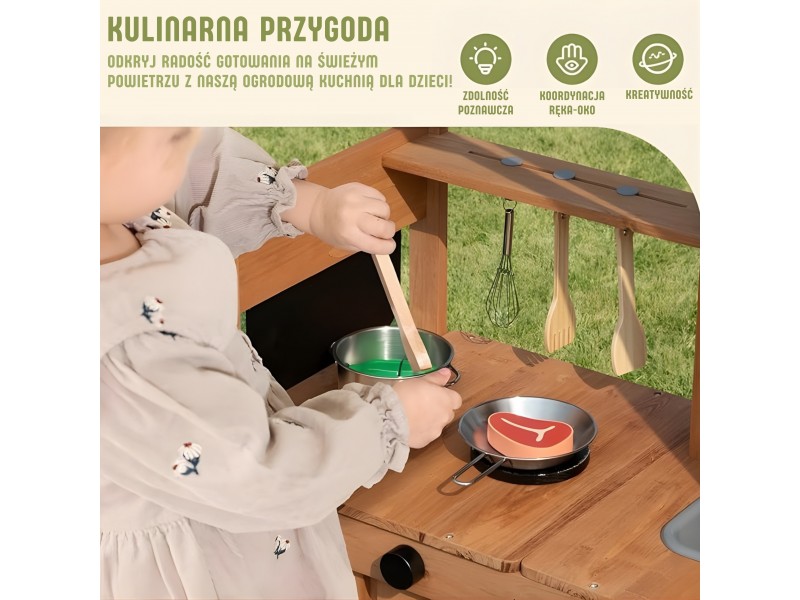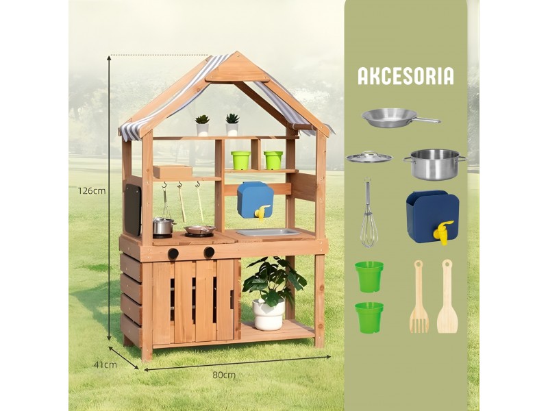 Prekės ženklo WOOPIE medinė lauko virtuvėlė – tai nepaprastas žaislas, kuris pavers jūsų sodą, terasą ar balkoną profesionaliu kulinarinių eksperimentų centru. Ši tvirta konstrukcija, pagaminta iš eglės medienos masyvo, leidžia vaikams saugiai žaisti su vandeniu, smėliu ir purvu – tuo, ką mažyliai mėgsta labiausiai. Virtuvėlėje įmontuota veikianti vandens talpa su kraneliu, todėl žaidimas tampa dar tikroviškesnis ir įtraukiantis. Virš stalviršio yra stilingas medžiaginis stogelis su juostelėmis, kuris karštomis dienomis apsaugos mažuosius virėjus nuo saulės. Rinkinyje taip pat yra kriauklė, kaitlentė, kreidos lenta meniu užrašams bei lentynos ir kabliukai įrankiams susidėti. Pridedami priedai, apjungiantys virtuvės ir sodininkystės pasaulius, leidžia žaisti įvairiapusiškai – nuo „žolės sriubos“ virimo iki tikrų gėlių sodinimo į pridedamą vazonėlį.