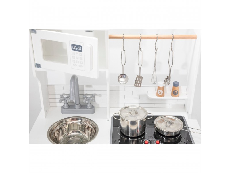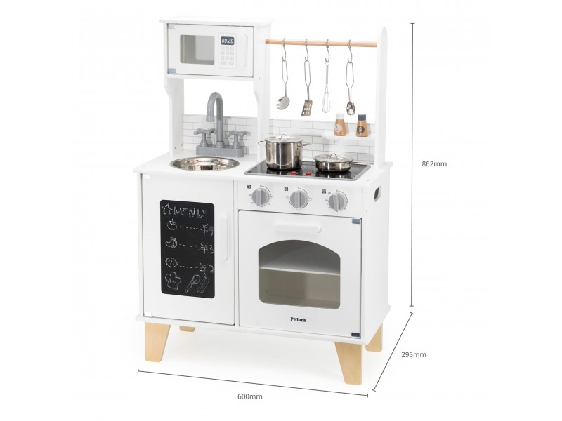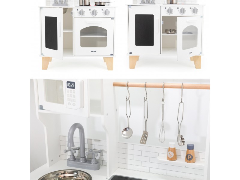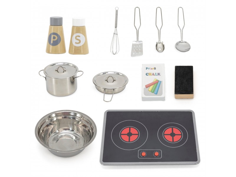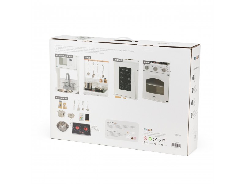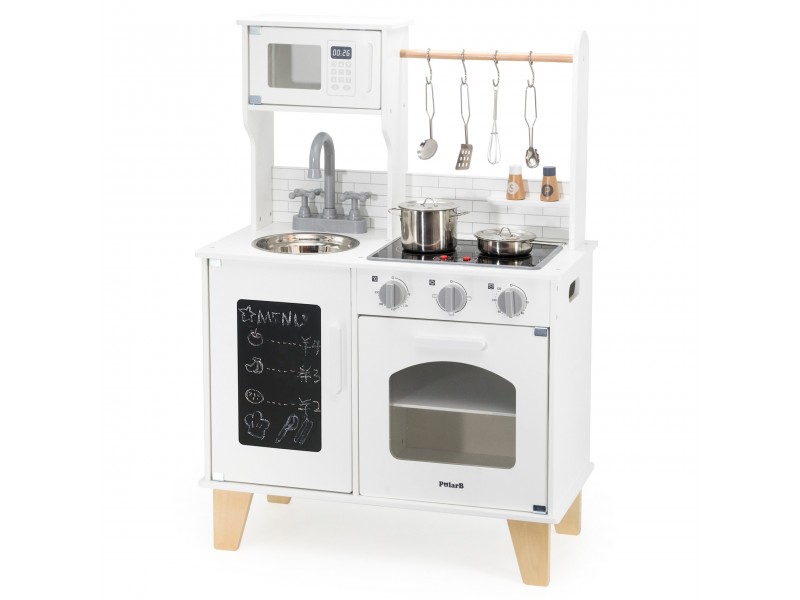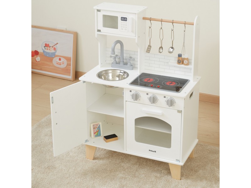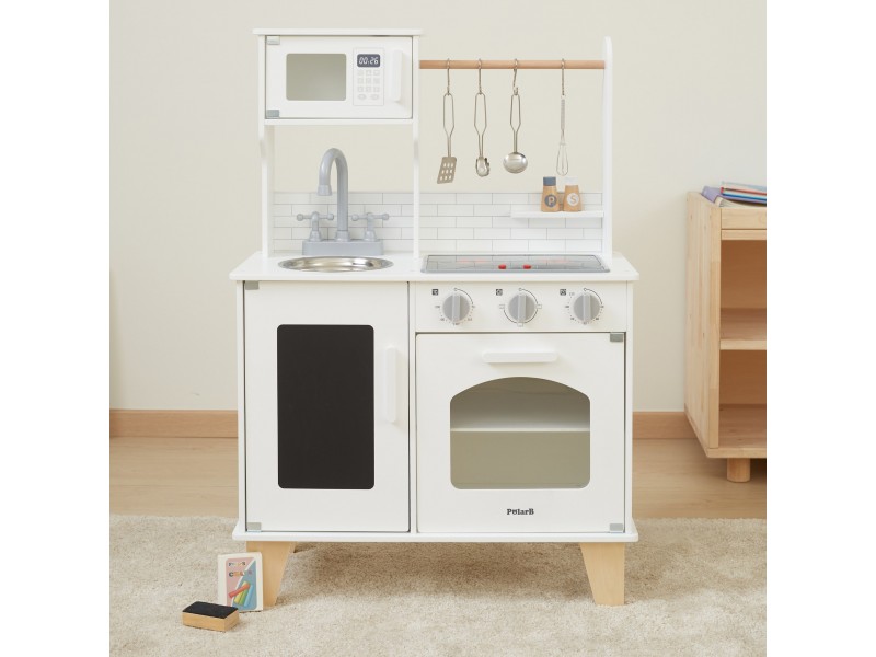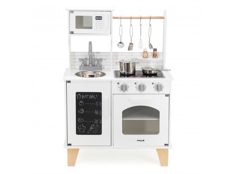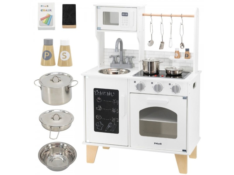 VIGA „PolarB“ serijos medinė virtuvėlė su kreidos lenta – tai svajonių baldas kiekvienam mažajam šefui. Šis lavinamasis žaislas leidžia vaikams mėgdžioti suaugusiuosius ir kartu ruošti maistą, sujungiant mokymąsi su puikia pramoga. Virtuvėlėje yra interaktyvių detalių, tokių kaip maisto gaminimo garsai ir šviečiantys degikliai, taip pat talpi kriauklė, orkaitė ir priekinė kreidos lenta, puikiai tinkanti piešti bei užsirašyti mėgstamus receptus. Ši viryklė puikiai dera su įvairiais indų rinkiniais ir suteikia nuostabų pagrindą kūrybingiems vaidmenų žaidimams.