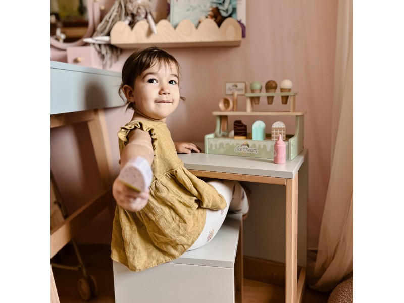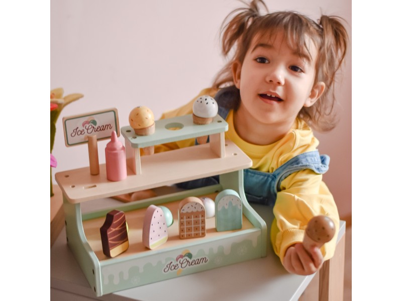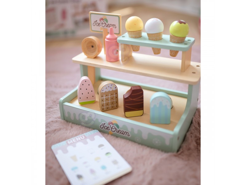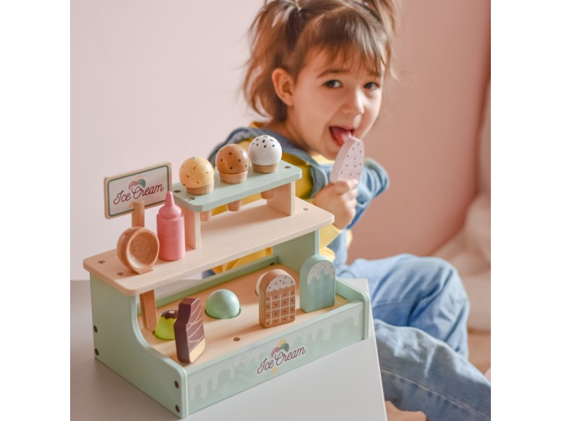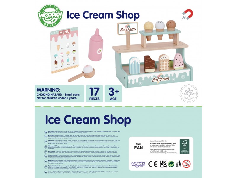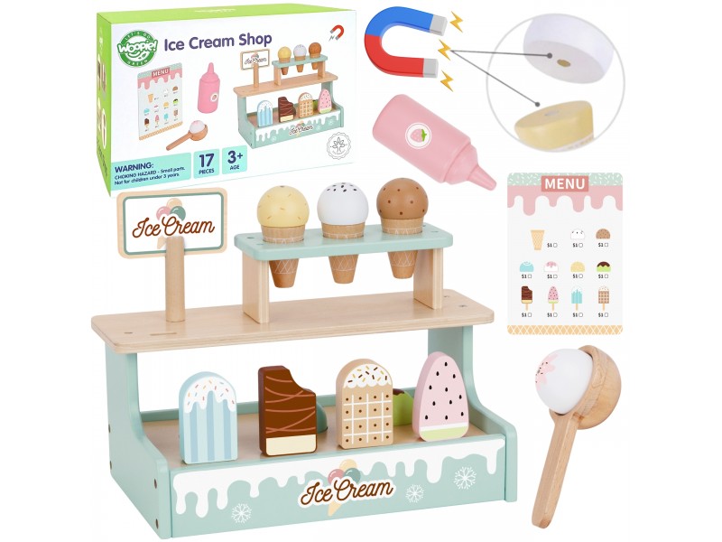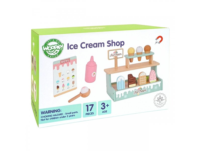Tapkite ledų meistru su žavingu Woopie Green prekystaliu! Šis pastelinių spalvų rinkinys yra svajonių žaislas mažiesiems virėjams ir konditeriams. Vaikai gali žaisti parduotuvę, patiekti skanius ledus vafliuose, rutuliukais ar ant pagaliuko – viskas pagaminta iš saugios medienos ir gražiai nudažyta. Dėl magnetinių ledų rutuliukų ir pridedamo meniu mažylis gali įsijausti į ledų pardavėjo vaidmenį, lavindamas vaizduotę ir rankų įgūdžius žaidimo metu.