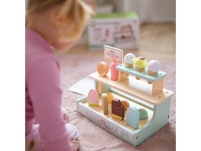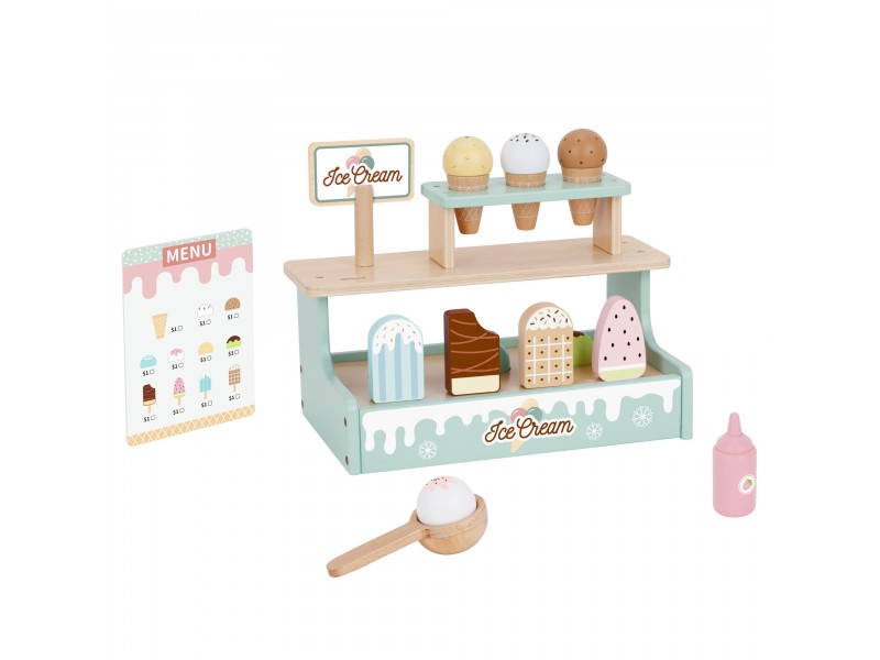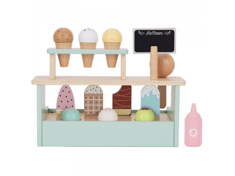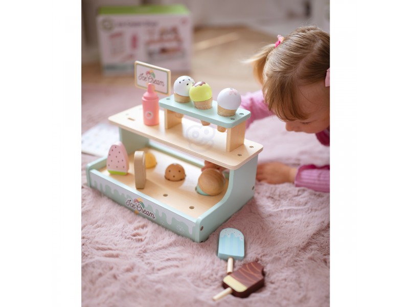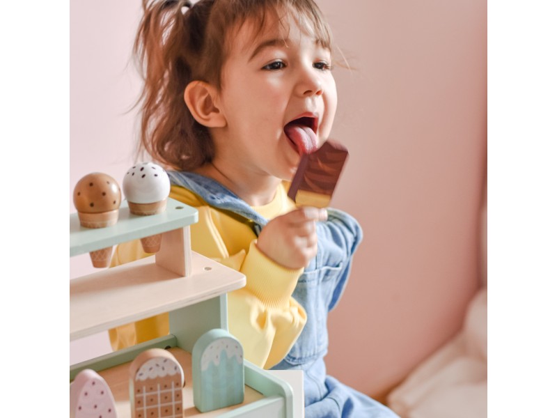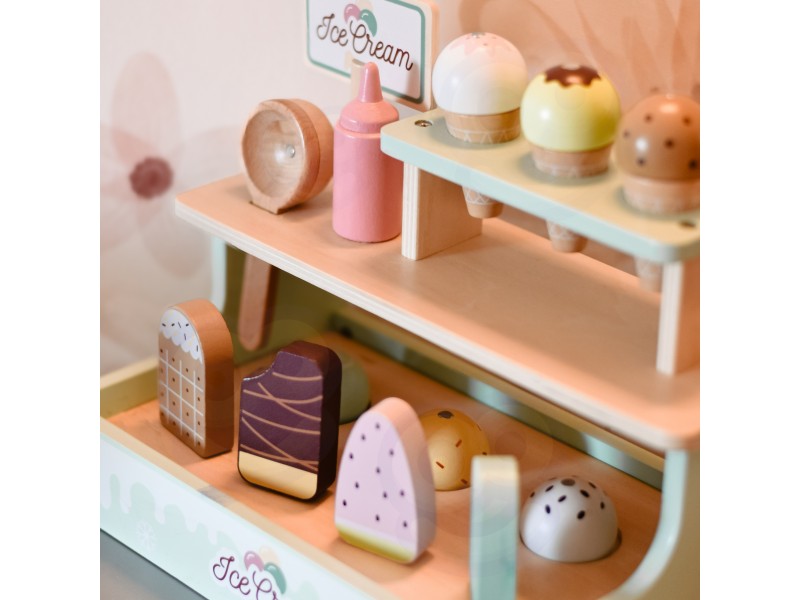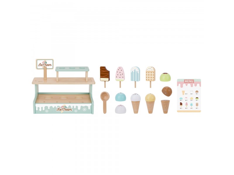 Tapkite ledų meistru su žavingu Woopie Green prekystaliu! Šis pastelinių spalvų rinkinys yra svajonių žaislas mažiesiems virėjams ir konditeriams. Vaikai gali žaisti parduotuvę, patiekti skanius ledus vafliuose, rutuliukais ar ant pagaliuko – viskas pagaminta iš saugios medienos ir gražiai nudažyta. Dėl magnetinių ledų rutuliukų ir pridedamo meniu mažylis gali įsijausti į ledų pardavėjo vaidmenį, lavindamas vaizduotę ir rankų įgūdžius žaidimo metu.