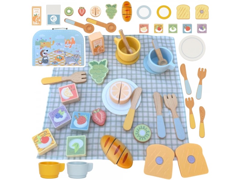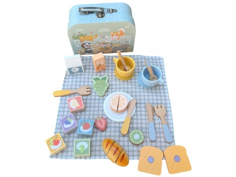 Medinis pikniko rinkinys lagamine yra puikus priedų komplektas vaidmenų žaidimams, kurių metu vaikai gali ruošti ir patiekti maistą. Šis gražus medinis rinkinys – tai ne tik žavingas žaislas, bet ir kvietimas į kūrybišką bei lavinamąją veiklą namuose ar gryname ore. Tai ideali dovana mažiesiems. Visi elementai supakuoti į praktišką žydrą lagaminą, todėl žaislą lengva tvarkingai laikyti ir patogu pasiimti į kelionę. Rinkinys puikiai tiks tiek savarankiškam žaidimui, tiek bendrai veiklai su broliais, seserimis ar draugais.