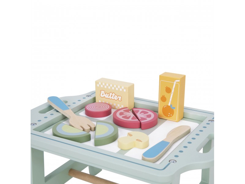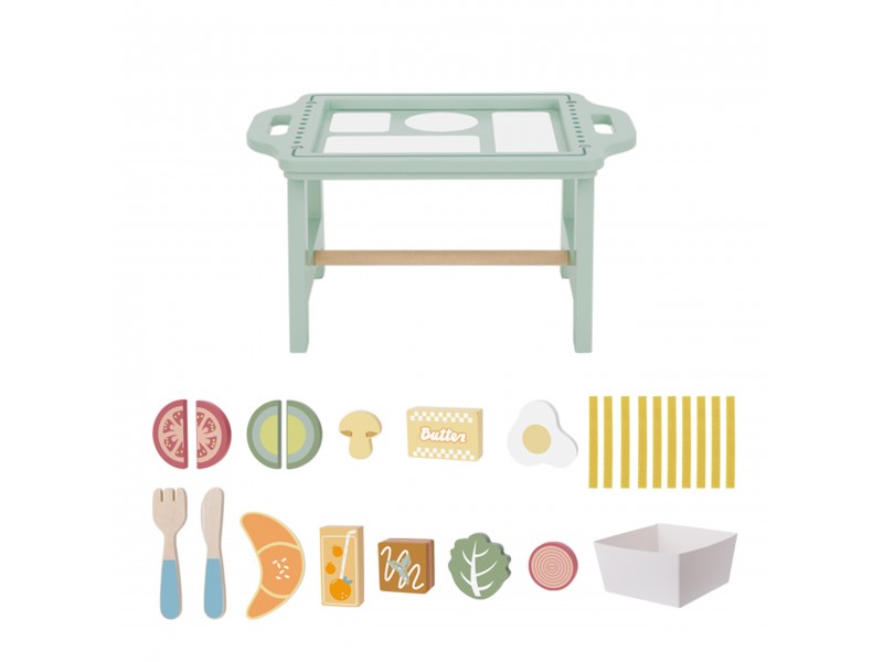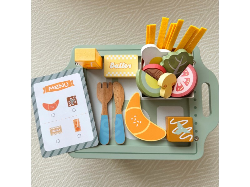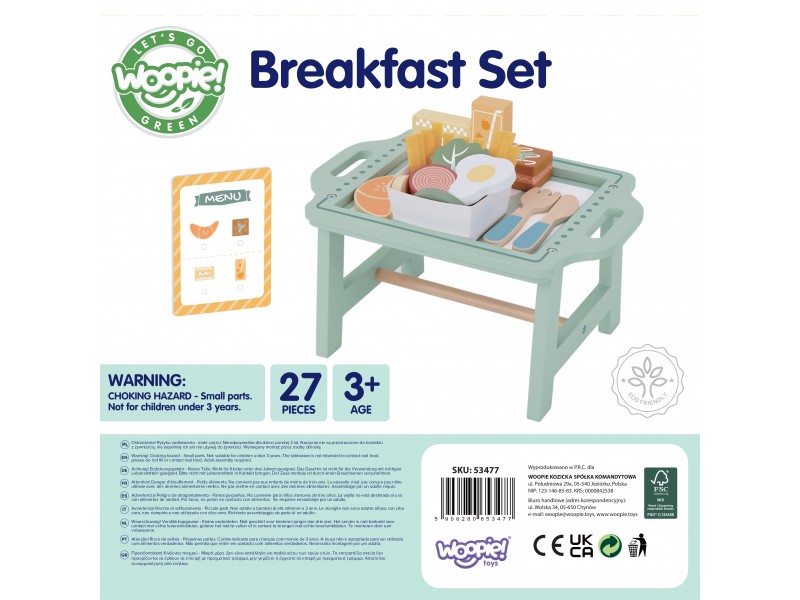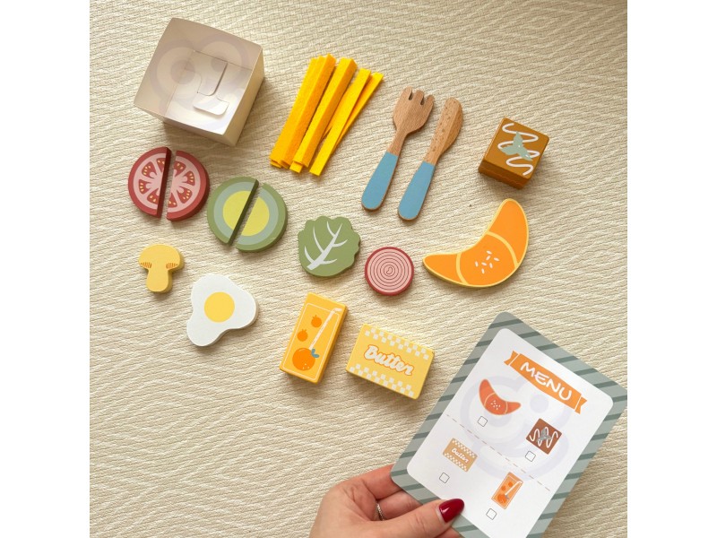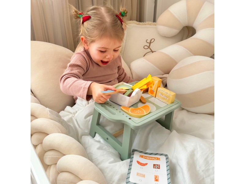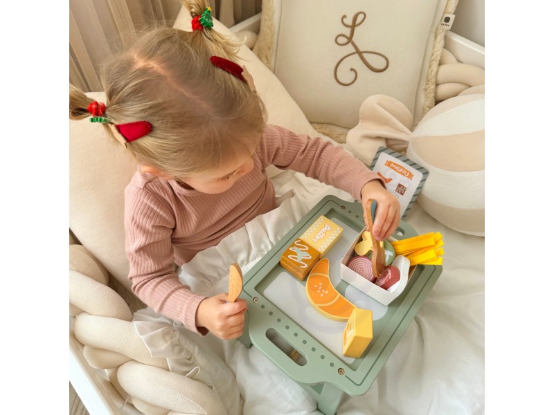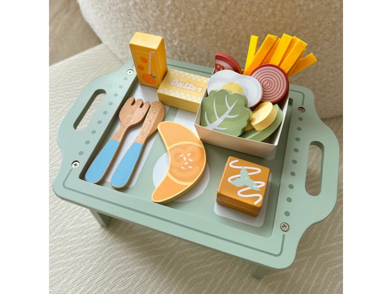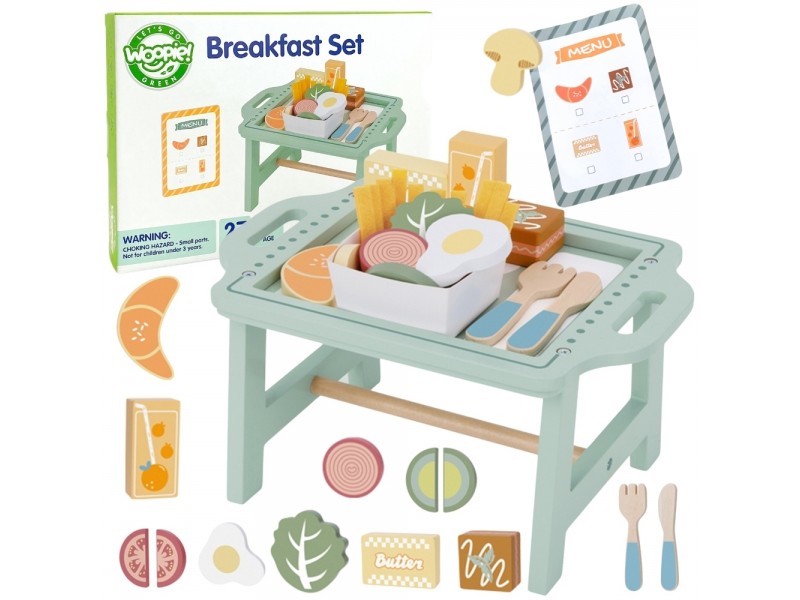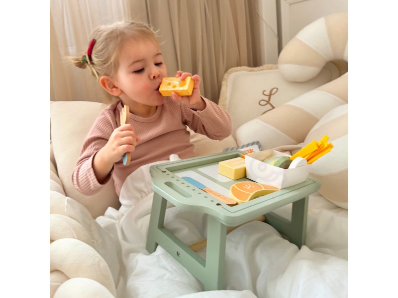 „Woopie Green“ pusryčių rinkinys – tai svajonių pusryčiai, patiekti tiesiai į lovą! Paverskite įprastą žaidimą kulinariniu nuotykiu, kupinu skonio ir stiliaus. Šis pastelinis pusryčių rinkinys yra tikras hitas mažiesiems virtuvės šefams, kurie mėgsta žaisti maisto gaminimą ir vaišinimą nuo ryto iki vakaro. Žavus pastelinis padėklas ir tikroviškai pagaminti mediniai elementai užtikrina, kad žaidimas taptų ypač įtraukiantis ir įkvepiantis.