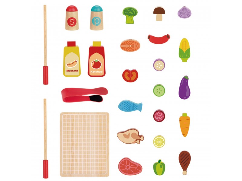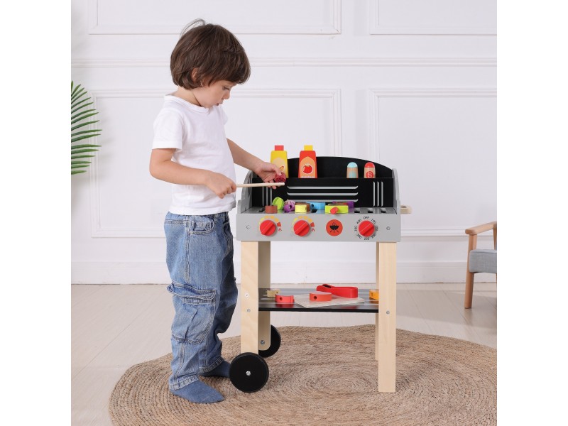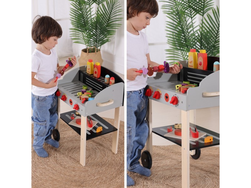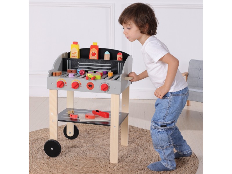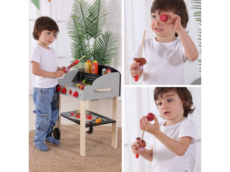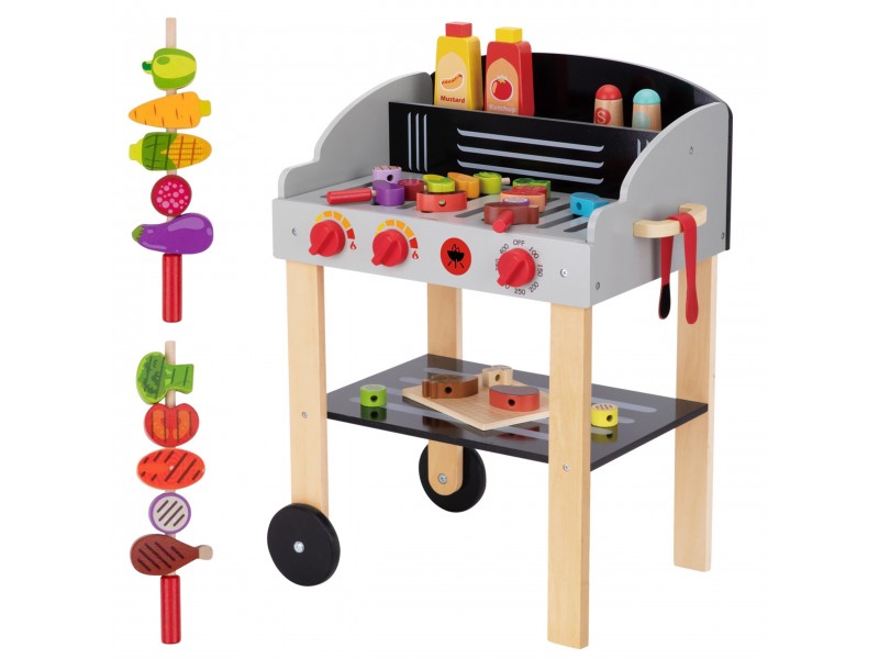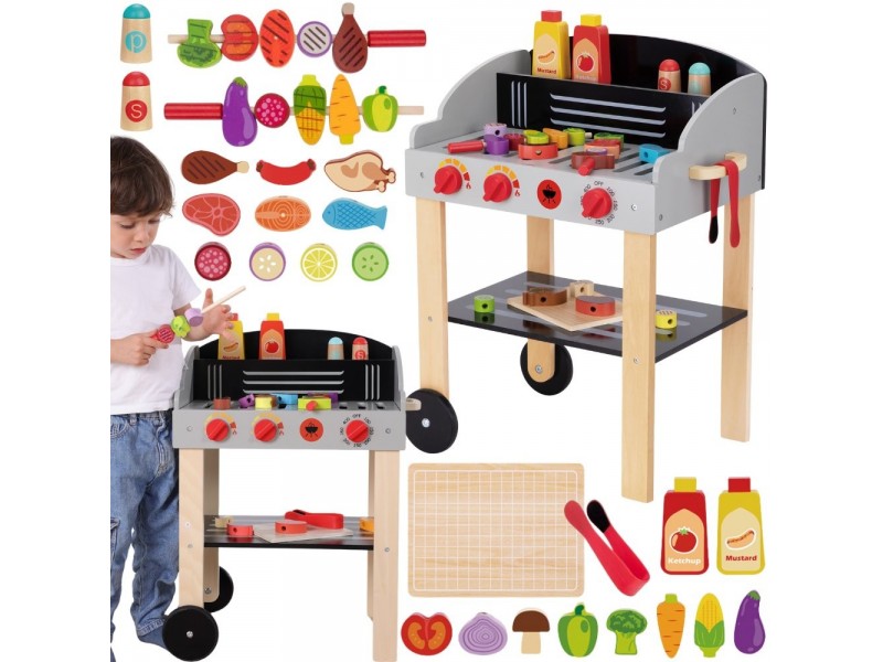 Medinis sodo grilis iš Woopie prekių ženklo – tai puikus pasirinkimas mažiesiems šefams, mėgstantiems mėgdžioti suaugusiuosius. Šis mobilus rinkinys ant ratukų leidžia mėgautis grilio pramogomis tiek namuose, tiek sode. Pagamintas iš aukštos kokybės medienos ir nudažytas vaikams saugiais dažais, žaislas žavi ryškiomis spalvomis ir dėmesiu detalėms. Grilis turi atidaromą dangtį, patogią lentynėlę priedams ir rankenėles, imituojančias tikro įrenginio veikimą. Rinkinyje yra gausybė virtuvės reikmenų: iešmeliai, maisto produktai, padažai bei žnyplės, užtikrinantys ilgai trunkančią ir kūrybišką žaidimų sesiją. Tai tobulas lavinamasis žaislas, padedantis mokytis gaminti maistą ir ugdyti kulinarinę aistrą.