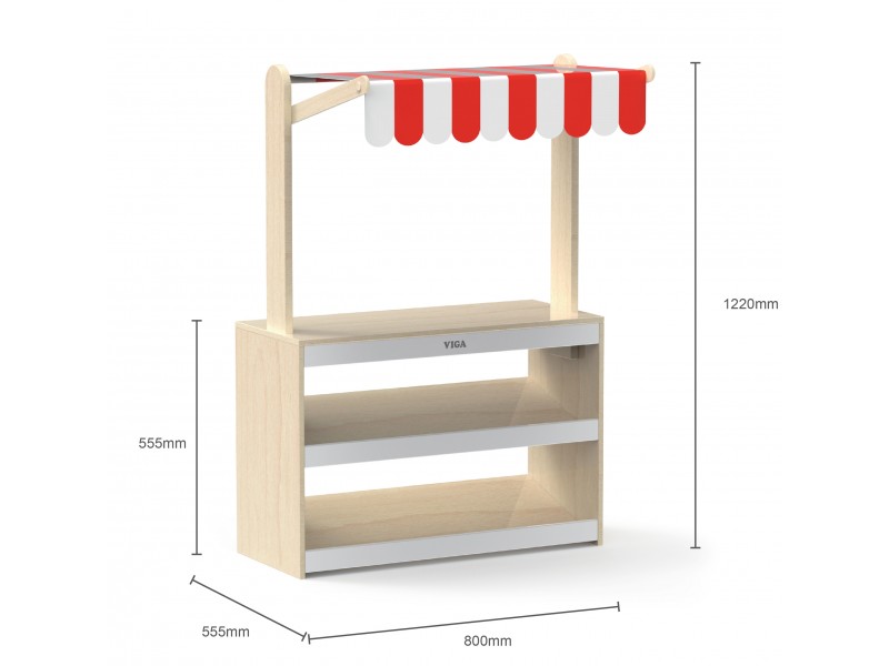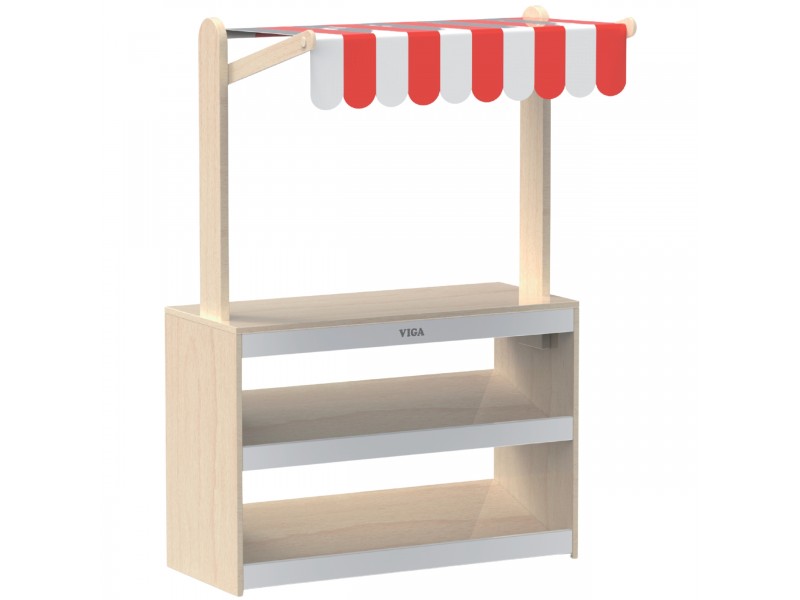 Viga medinis prekystalis perkelia vaidmenų žaidimus į naują lygį! Šis tvirtos medienos prekystalis su žavingu raudonos ir baltos spalvų dryžuotu stogeliu akimirksniu patrauks vaikų dėmesį ir taps mėgstamiausia žaidimų vieta. Jame įrengtos dvi erdvios lentynos, kuriose mažasis prekeivis galės patogiai išdėlioti savo prekes ir žaisti parduotuvę. Šis nuostabus medinis žaislas ne tik skatina kūrybiškumą, bet ir padeda vaikams lavinti socialinius įgūdžius smagių žaidimų metu.