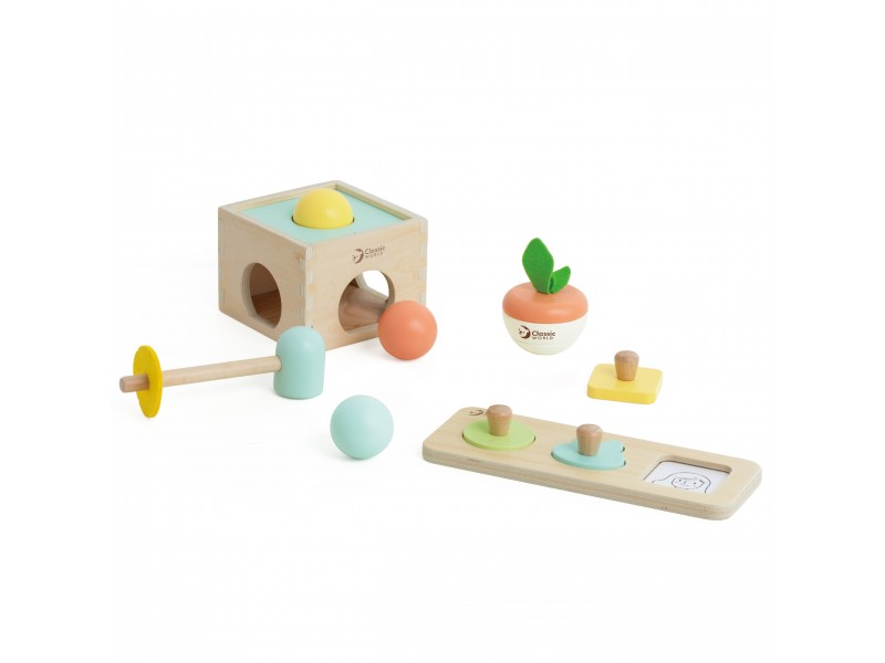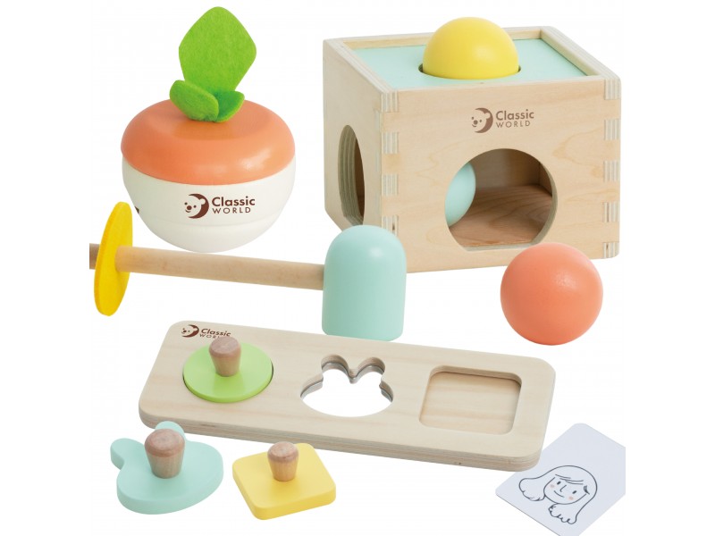 Šis žavingas pastelinių spalvų edukacinis rinkinys, sukurtas prekės ženklo "Classic World", yra tobula dovana vaikams nuo 6 iki 12 mėnesių. Rinkinys pateikia mažyliams naujus iššūkius, susijusius su formų derinimu ir pirmaisiais matematiniais įgūdžiais. Tai puikus būdas subalansuotai ugdyti ir lavinti vaiko gebėjimus, suteikiant jam visus reikalingus žaislus linksmiems ir naudingiems žaidimams. Žaislai supakuoti į gražią, spalvingą dėžutę, todėl idealiai tinka dovanai.