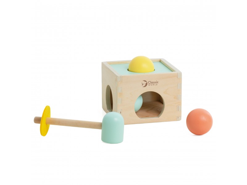 Rankų ir pečių judesių kontrolės mokymasis yra labai svarbus etapas, padedantis vaikui ruoštis atsistoti. Naudodamas saugų medinį plaktuką ir mušdamas kamuoliukus, mažylis lavina rankų-akių koordinaciją ir motorinius įgūdžius. Tai taip pat puikus pratimas, mokantis susikaupti ir išlaikyti dėmesį.