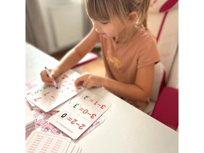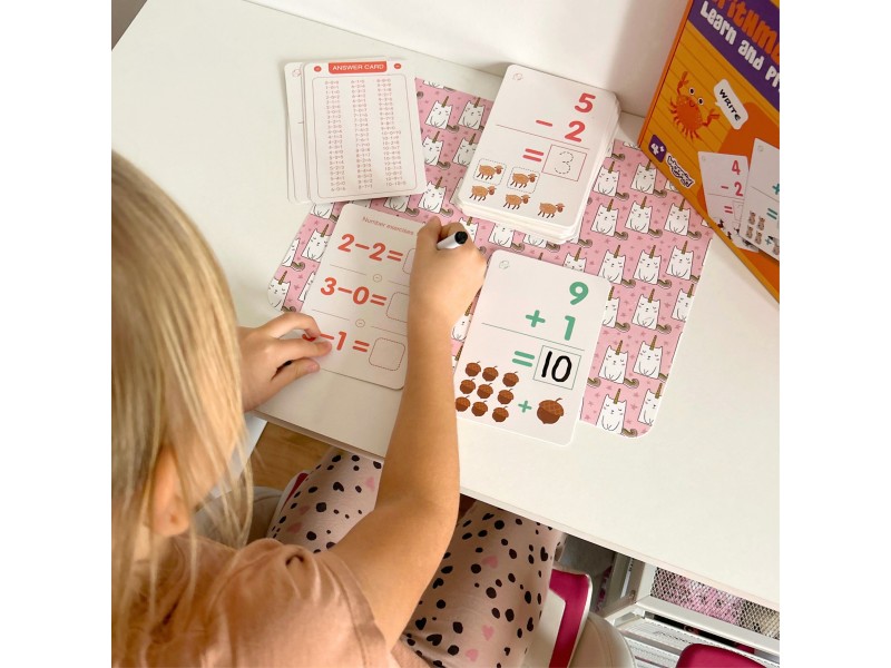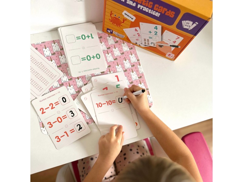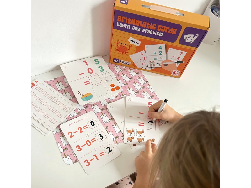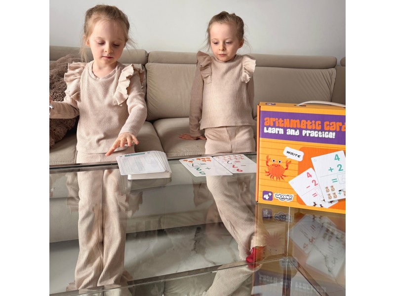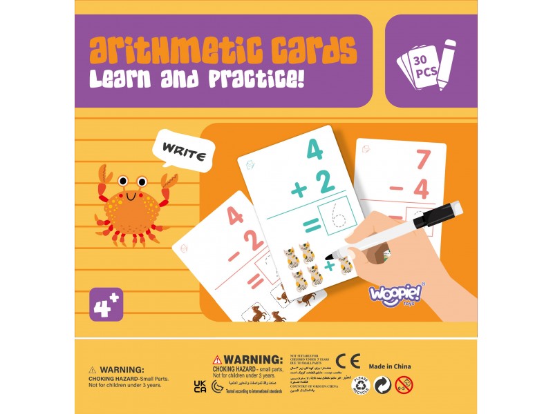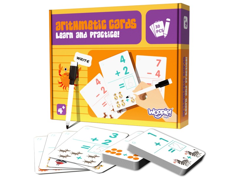 WOOPIE prekės ženklo skaičiavimo mokymosi kortelės yra puiki dovanos idėja mūsų vaikams. Tai nuostabus rinkinys, kurį sudaro 30 dvipusių kortelių, skatinančių vaiką mokytis skaičių ir skaičiavimo. Rinkinys sukurtas taip, kad vaikas galėtų daug kartų treniruotis skaičiuoti, naudodamas pridedamą nutrinamą žymeklį. Kortelės skirtos mokytis sudėties ir atimties. Siekiant palengvinti mokymąsi, kortelės turi du lygius – pradžioje vaikas gali naudotis puse, kurioje matematiniai veiksmai papildyti paveikslėliais, padedančiais suskaičiuoti rezultatą. Kita kortelių pusė skirta skaičiavimams be paveikslėlių pagalbos. Dėl tokio mokymosi modulio jūsų vaikas nejaus spaudimo dėl naujų žinių sudėtingumo, o matematinių užduočių sprendimas taps tikru malonumu! Norint motyvuoti mažylį mokytis, po kiekvieno teisingai išspręsto pavyzdžio kortelės kampe galima nupiešti širdelę!